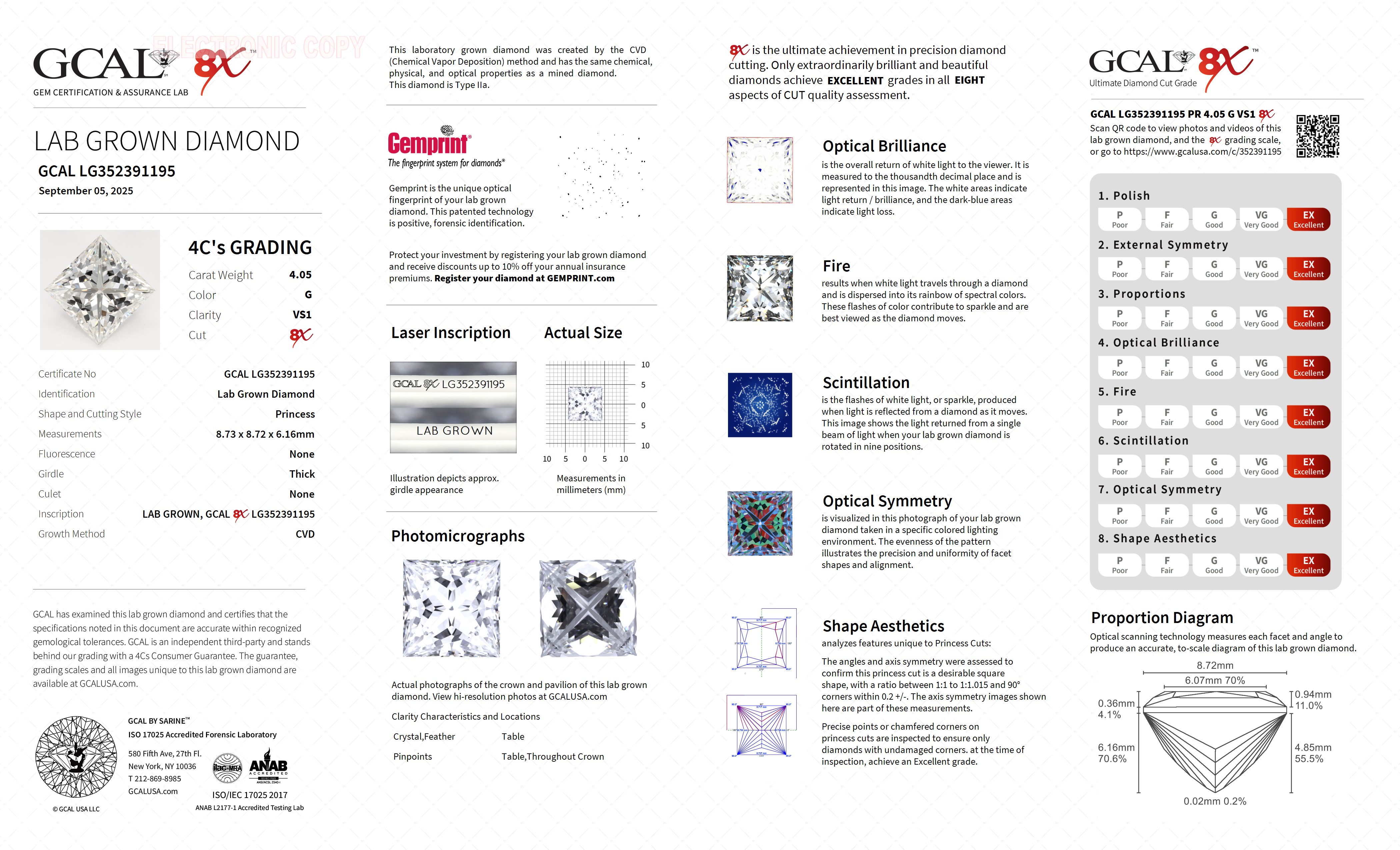 The GCAL certificate (#352391195) is an independent grading report that verifies this diamond's carat weight, color, clarity, cut, and other physical properties. It serves as a trusted third-party guarantee of the stone's quality. Always verify the certificate number on the issuing lab's website before purchasing.