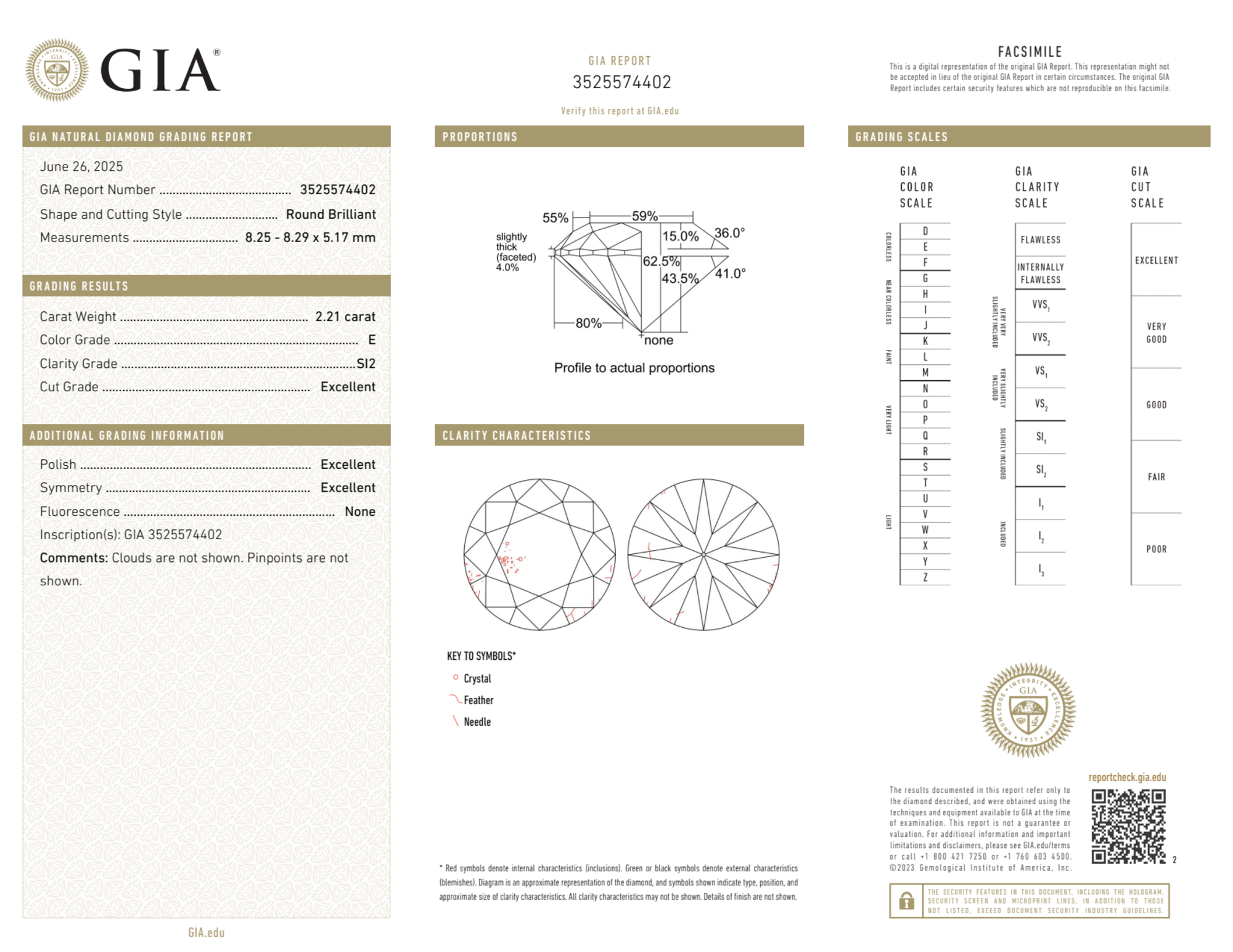 The GIA certificate (#3525574402) is an independent grading report that verifies this diamond's carat weight, color, clarity, cut, and other physical properties. It serves as a trusted third-party guarantee of the stone's quality. Always verify the certificate number on the issuing lab's website before purchasing.