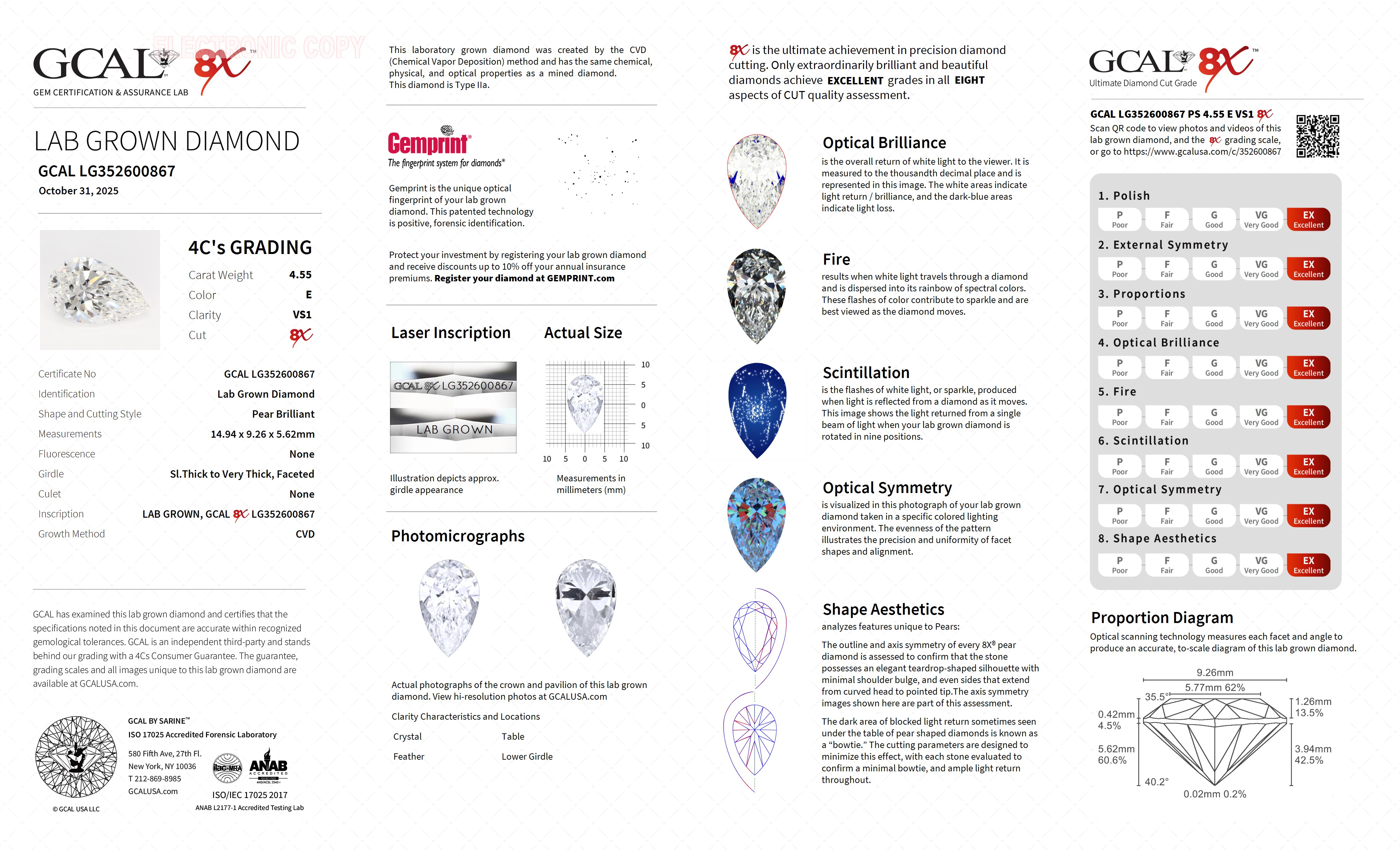 The GCAL certificate (#352600867) is an independent grading report that verifies this diamond's carat weight, color, clarity, cut, and other physical properties. It serves as a trusted third-party guarantee of the stone's quality. Always verify the certificate number on the issuing lab's website before purchasing.