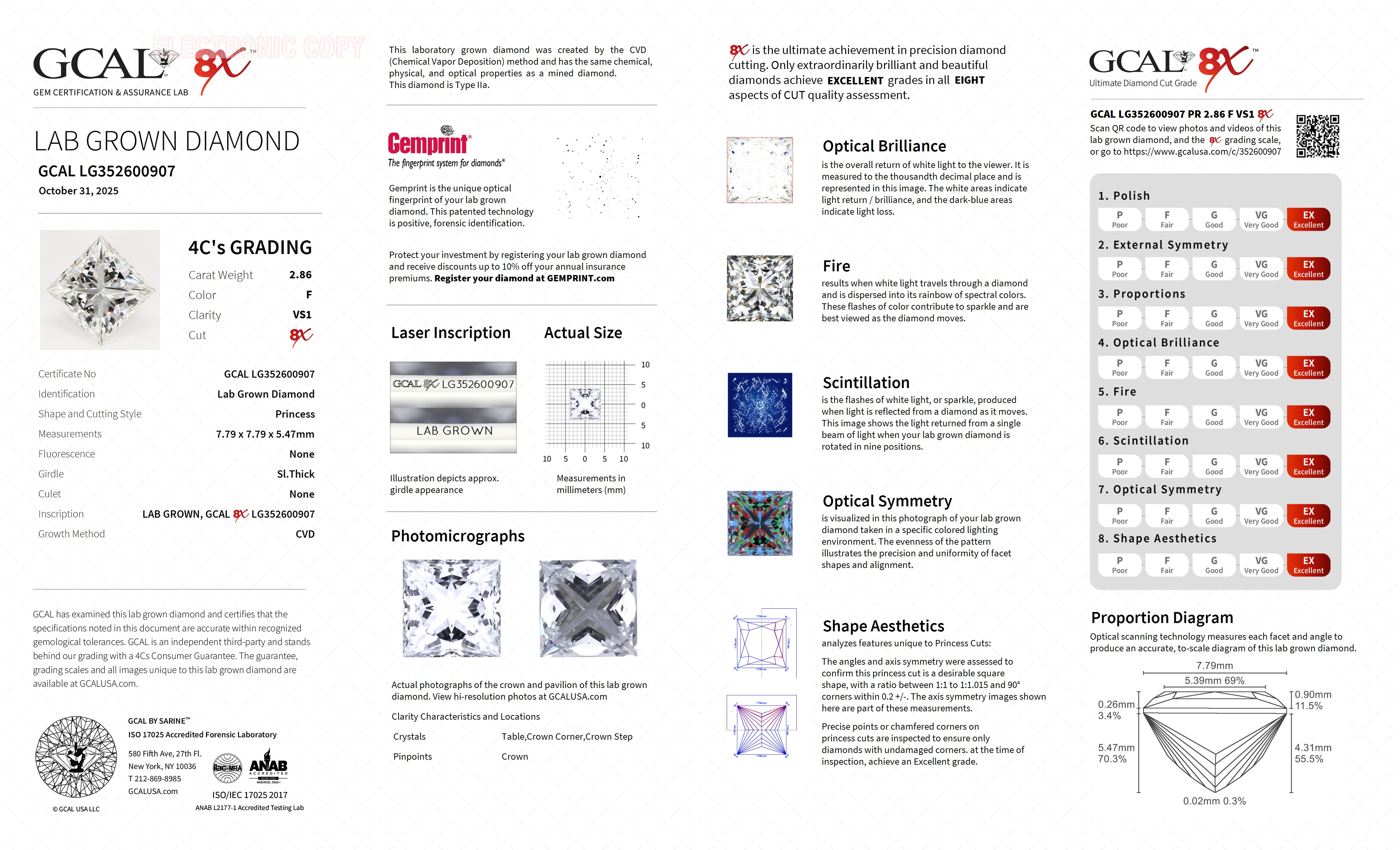 The GCAL certificate (#352600907) is an independent grading report that verifies this diamond's carat weight, color, clarity, cut, and other physical properties. It serves as a trusted third-party guarantee of the stone's quality. Always verify the certificate number on the issuing lab's website before purchasing.