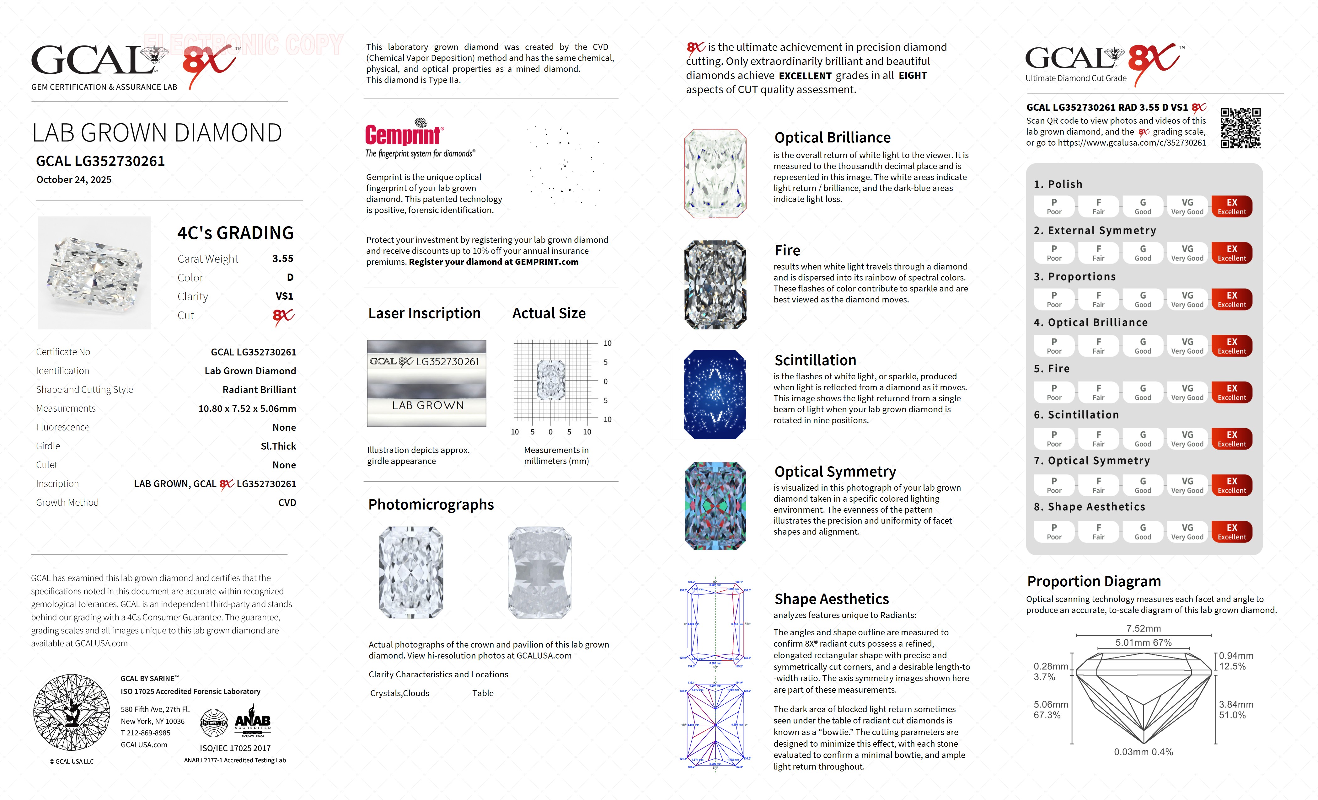 The GCAL certificate (#352730261) is an independent grading report that verifies this diamond's carat weight, color, clarity, cut, and other physical properties. It serves as a trusted third-party guarantee of the stone's quality. Always verify the certificate number on the issuing lab's website before purchasing.