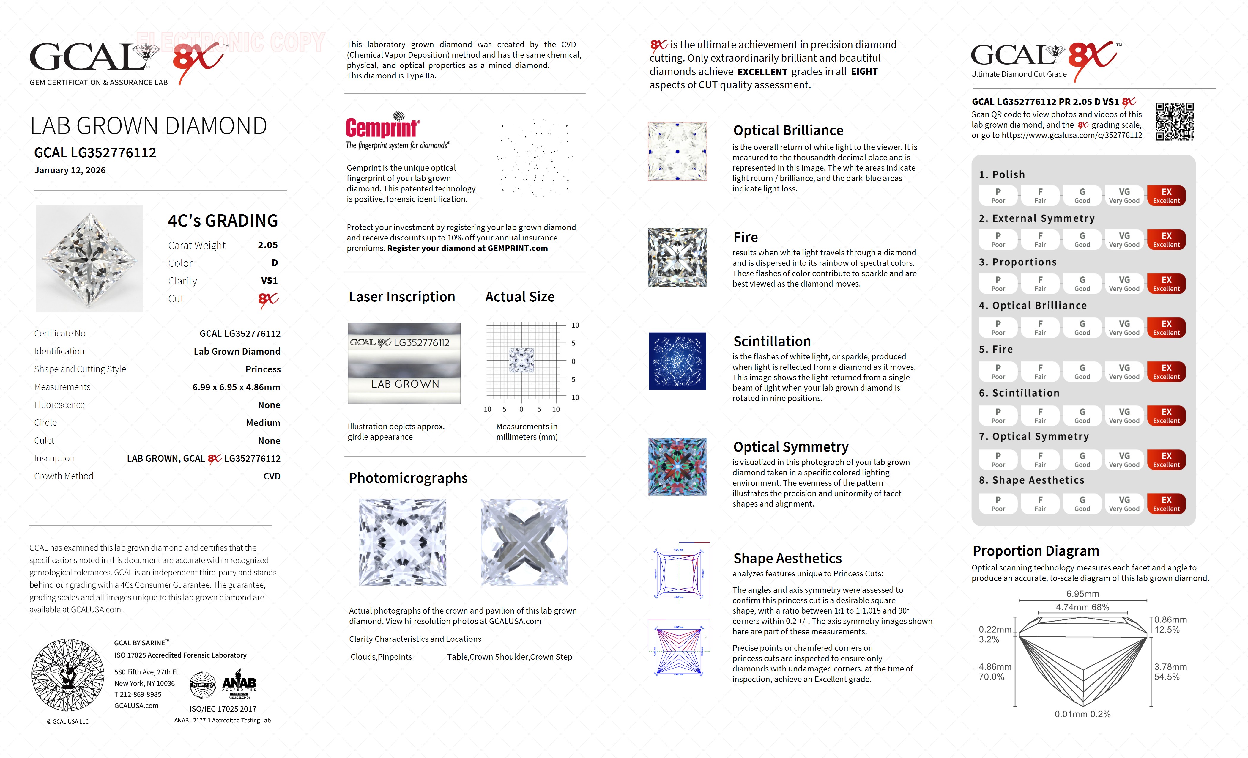 The GCAL certificate (#352776112) is an independent grading report that verifies this diamond's carat weight, color, clarity, cut, and other physical properties. It serves as a trusted third-party guarantee of the stone's quality. Always verify the certificate number on the issuing lab's website before purchasing.