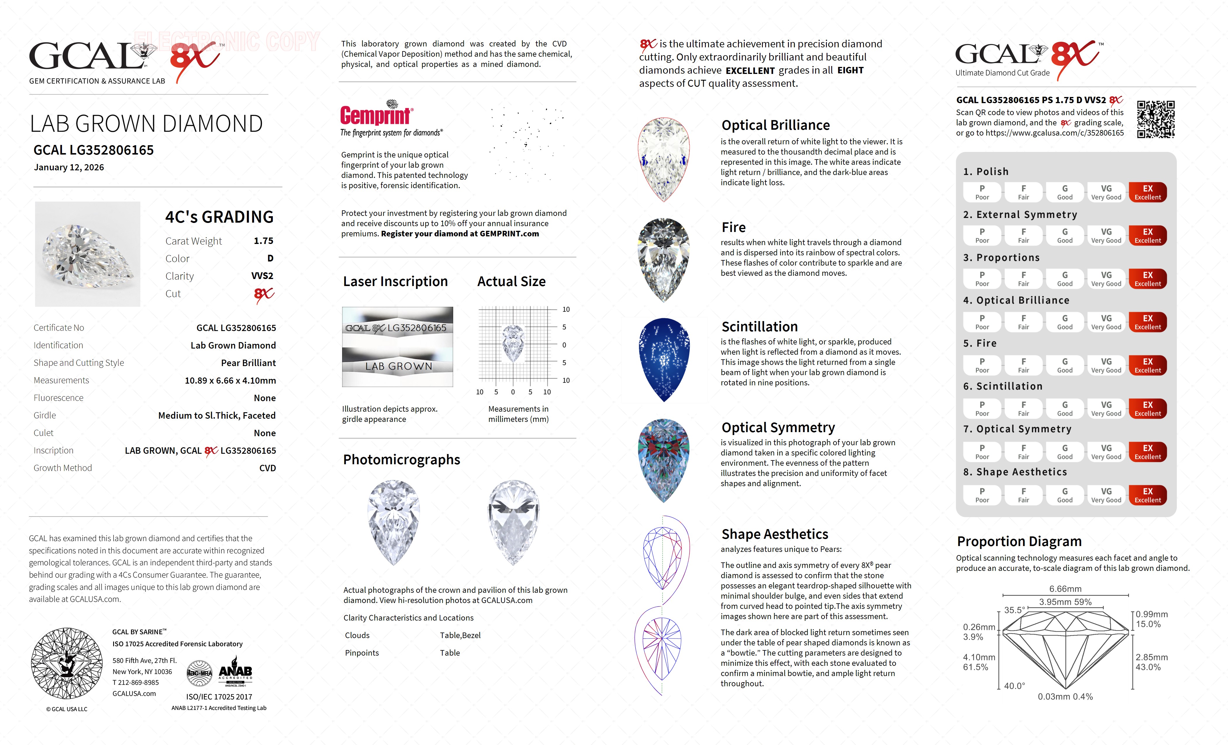The GCAL certificate (#352806165) is an independent grading report that verifies this diamond's carat weight, color, clarity, cut, and other physical properties. It serves as a trusted third-party guarantee of the stone's quality. Always verify the certificate number on the issuing lab's website before purchasing.