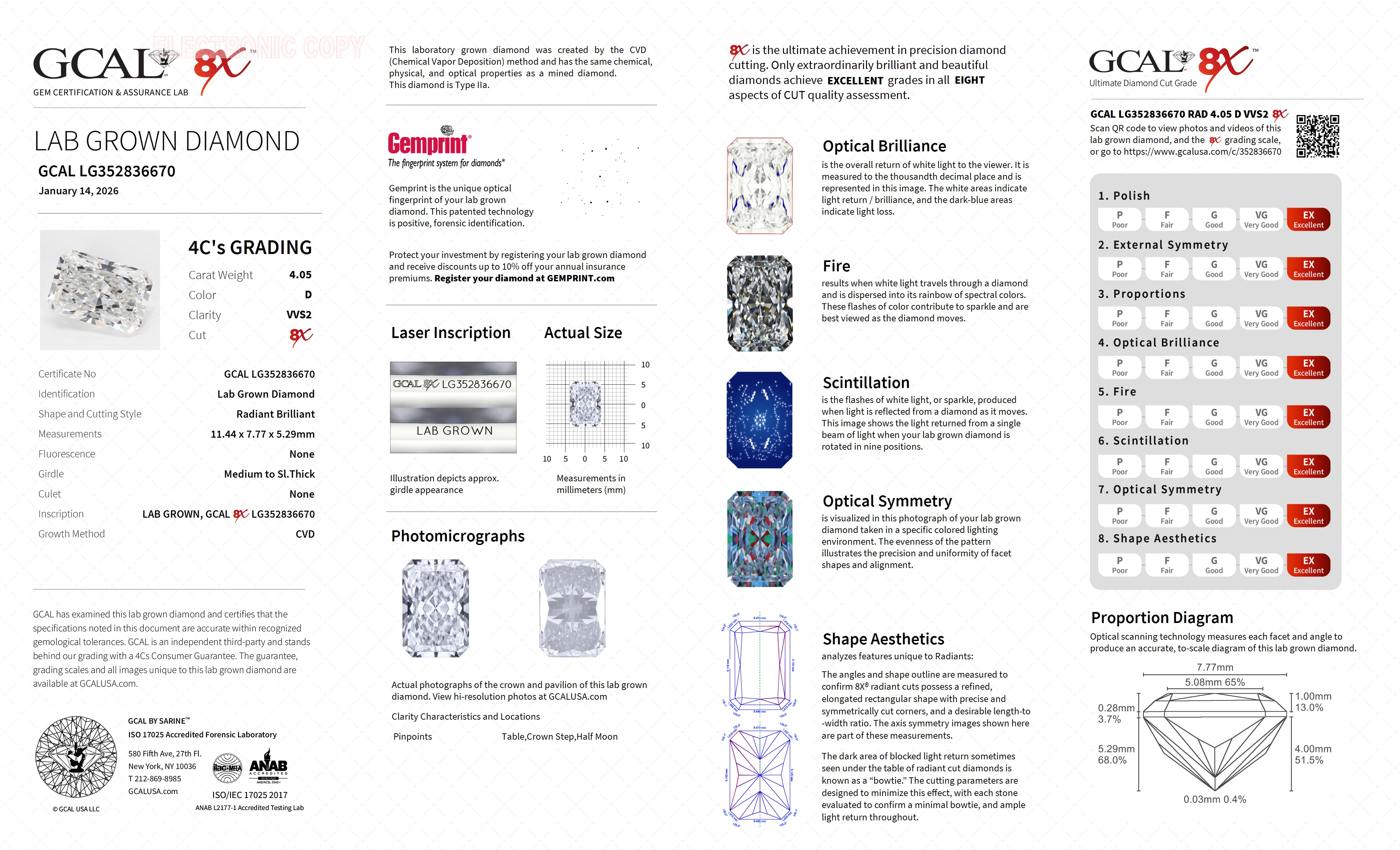 The GCAL certificate (#352836670) is an independent grading report that verifies this diamond's carat weight, color, clarity, cut, and other physical properties. It serves as a trusted third-party guarantee of the stone's quality. Always verify the certificate number on the issuing lab's website before purchasing.
