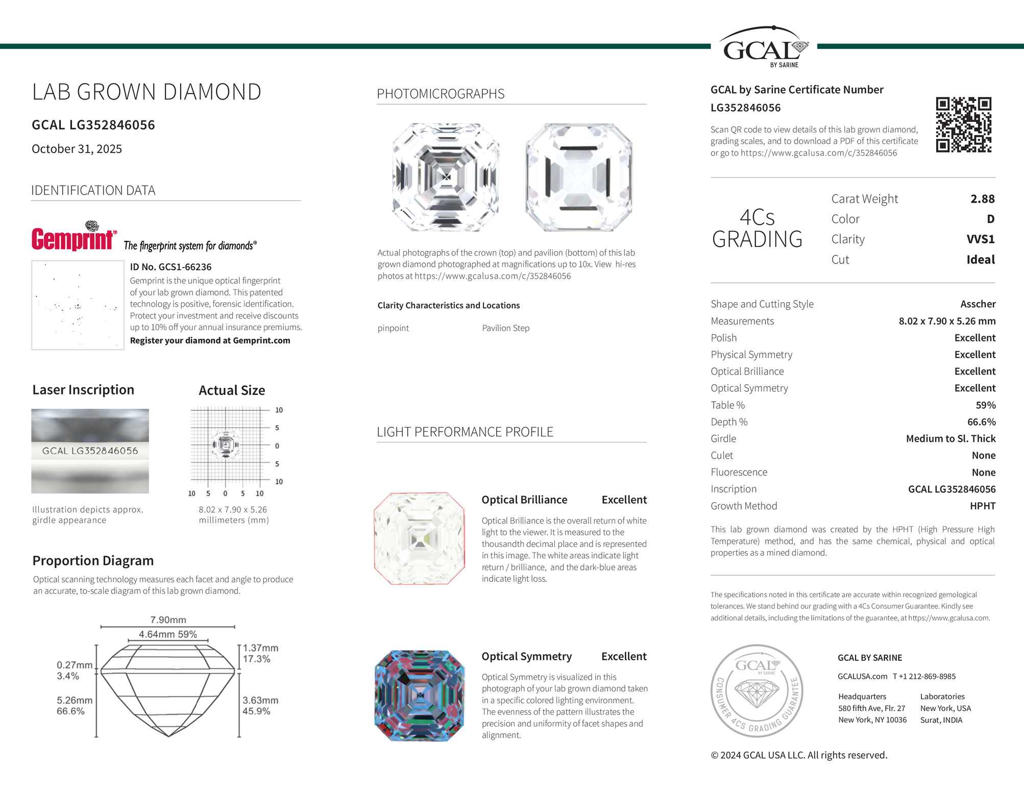 The GCAL certificate (#352846056) is an independent grading report that verifies this diamond's carat weight, color, clarity, cut, and other physical properties. It serves as a trusted third-party guarantee of the stone's quality. Always verify the certificate number on the issuing lab's website before purchasing.