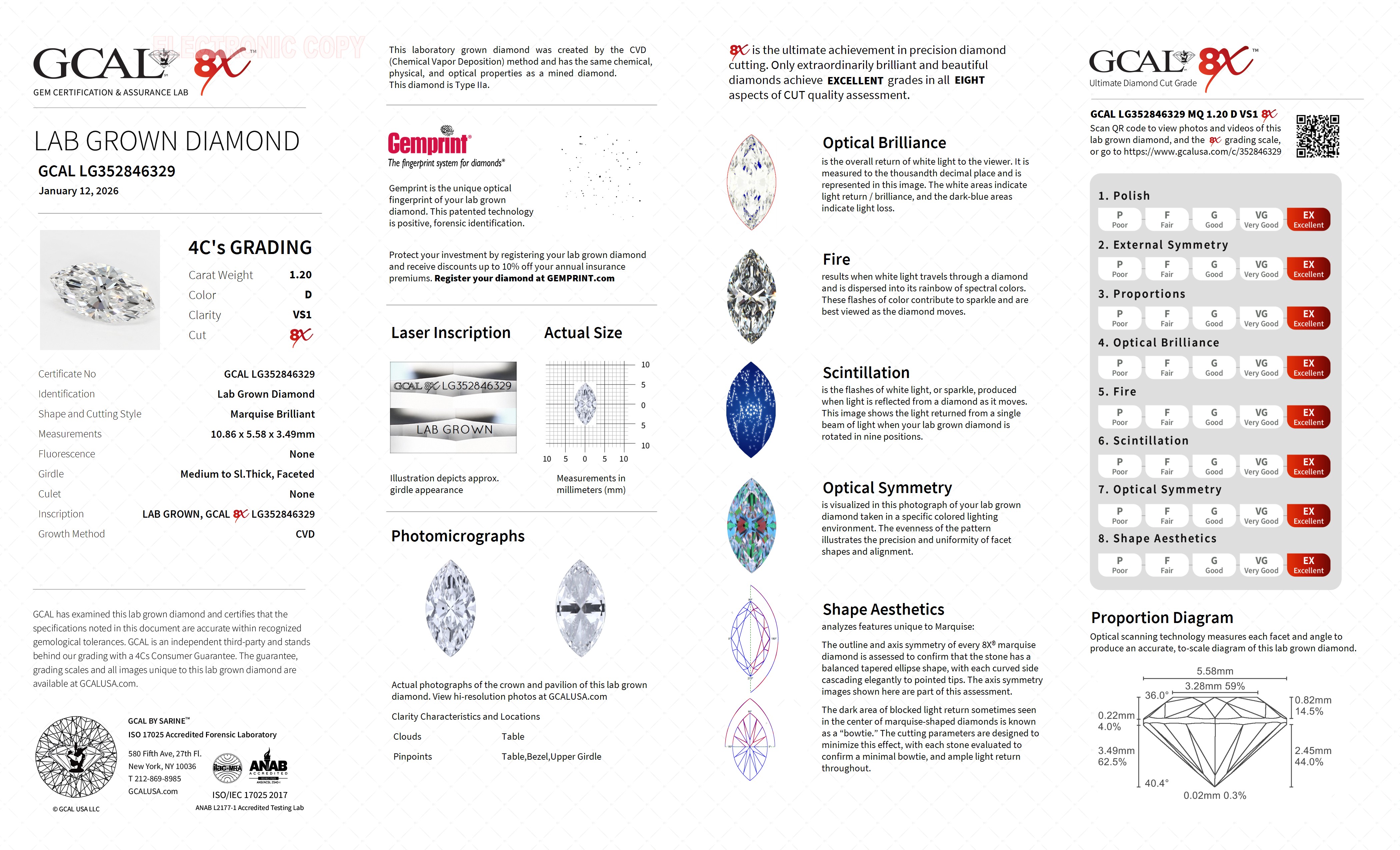 The GCAL certificate (#352846329) is an independent grading report that verifies this diamond's carat weight, color, clarity, cut, and other physical properties. It serves as a trusted third-party guarantee of the stone's quality. Always verify the certificate number on the issuing lab's website before purchasing.