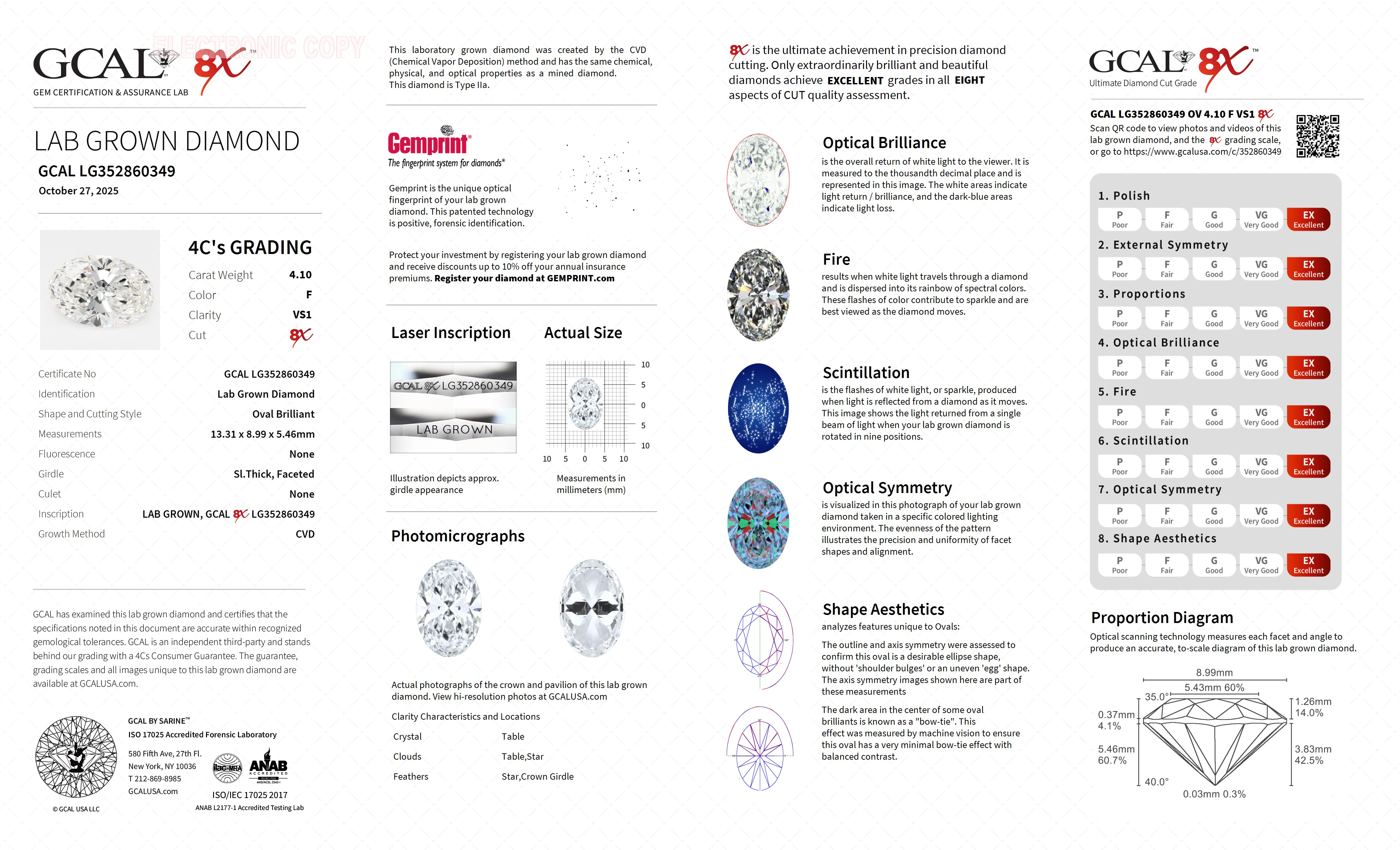 The GCAL certificate (#352860349) is an independent grading report that verifies this diamond's carat weight, color, clarity, cut, and other physical properties. It serves as a trusted third-party guarantee of the stone's quality. Always verify the certificate number on the issuing lab's website before purchasing.