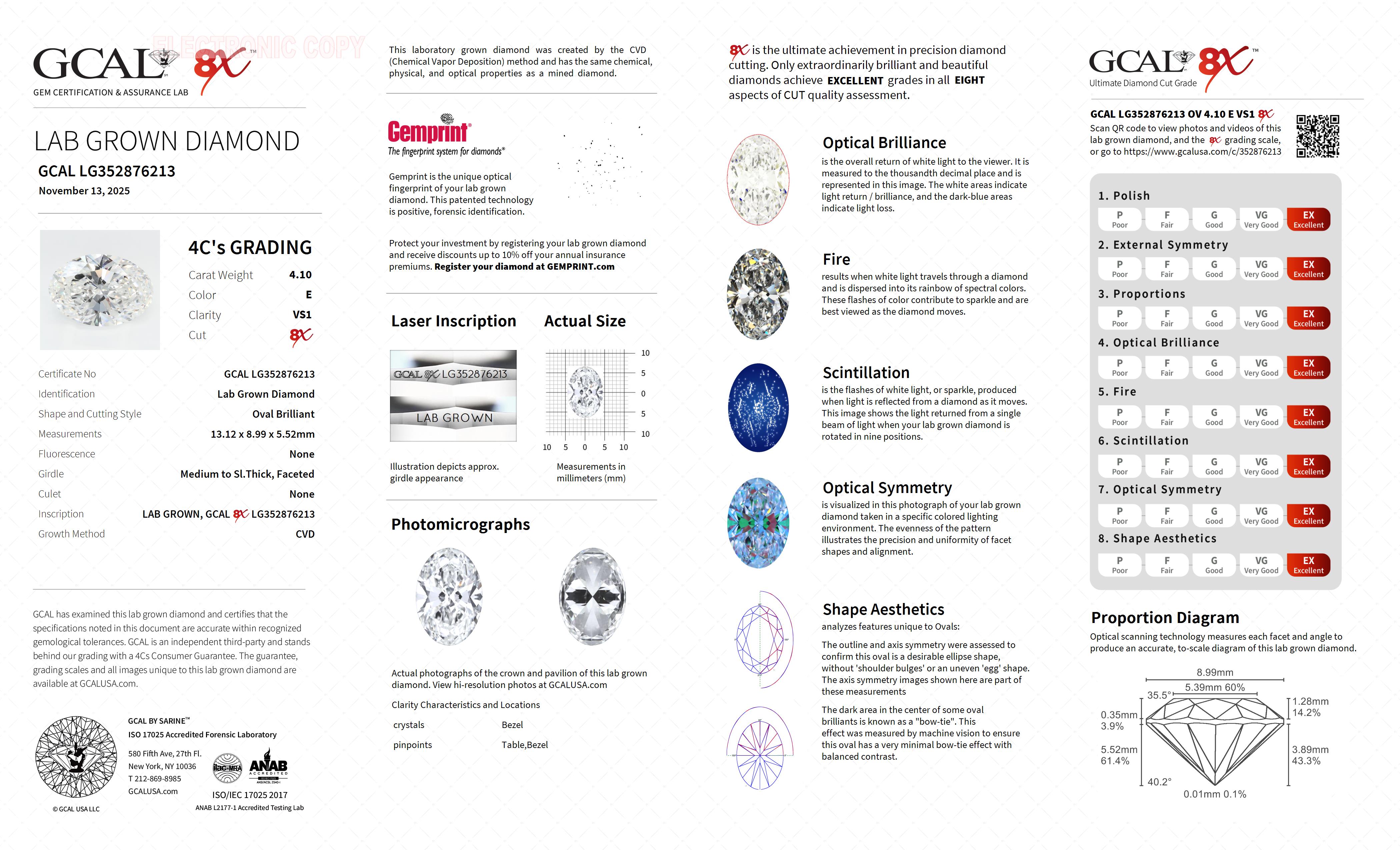 The GCAL certificate (#352876213) is an independent grading report that verifies this diamond's carat weight, color, clarity, cut, and other physical properties. It serves as a trusted third-party guarantee of the stone's quality. Always verify the certificate number on the issuing lab's website before purchasing.