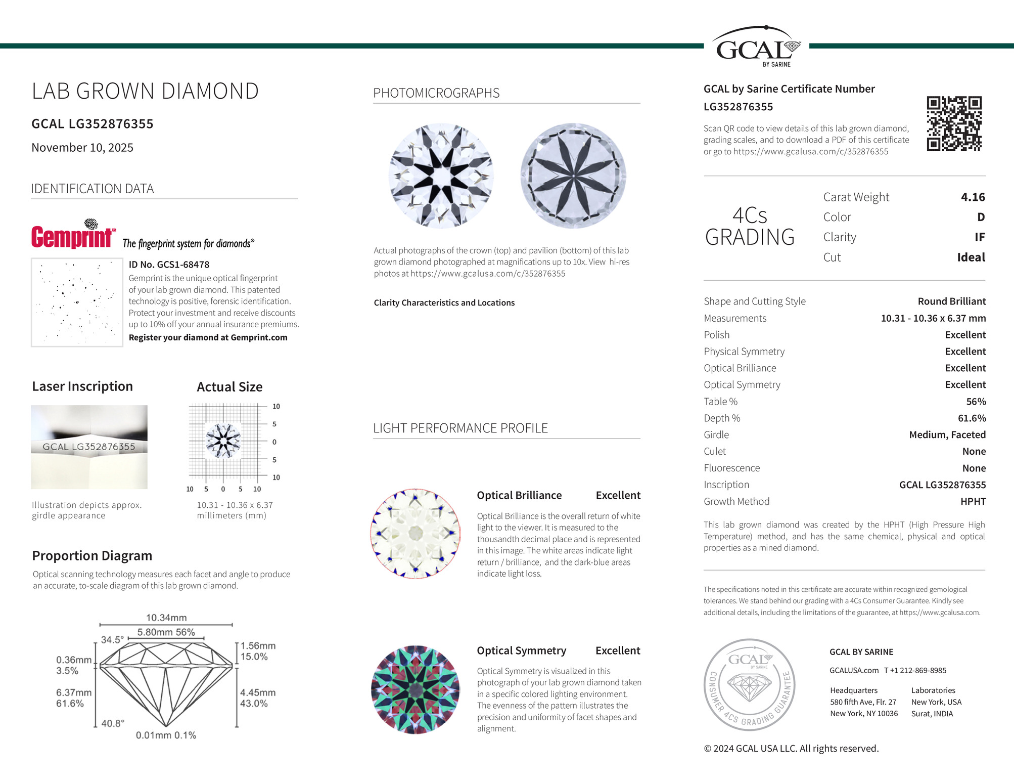 The GCAL certificate (#352876355) is an independent grading report that verifies this diamond's carat weight, color, clarity, cut, and other physical properties. It serves as a trusted third-party guarantee of the stone's quality. Always verify the certificate number on the issuing lab's website before purchasing.