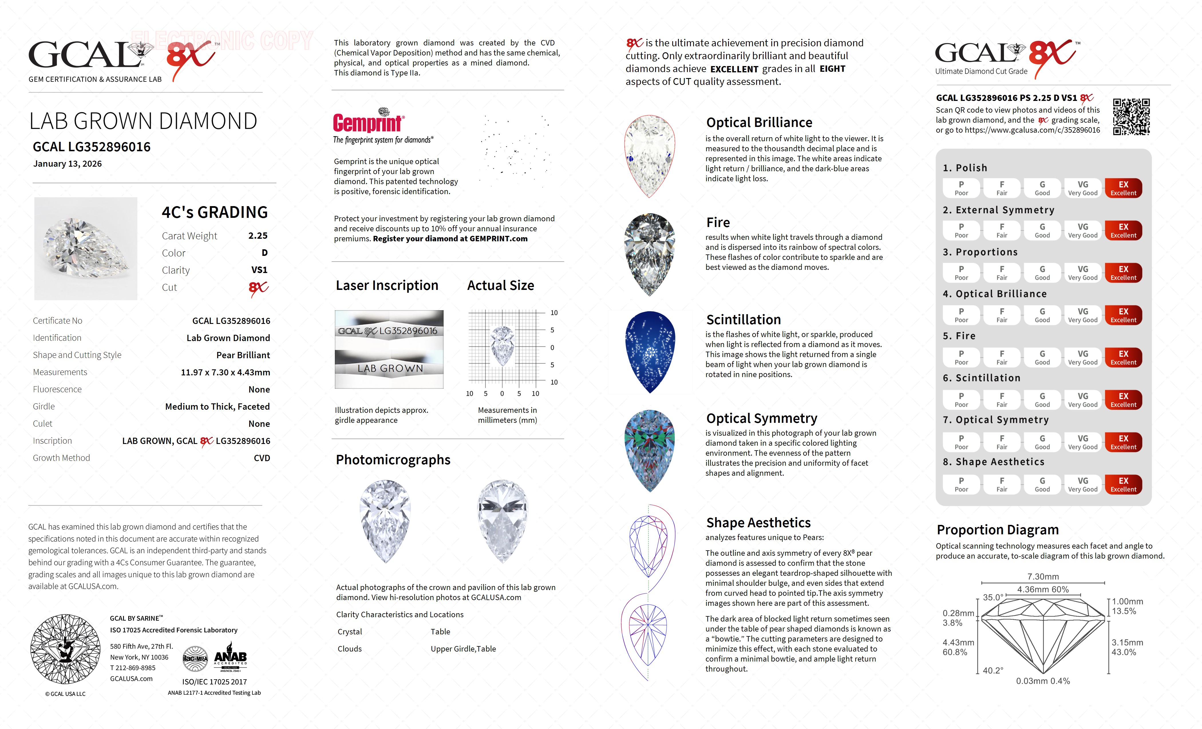 The GCAL certificate (#352896016) is an independent grading report that verifies this diamond's carat weight, color, clarity, cut, and other physical properties. It serves as a trusted third-party guarantee of the stone's quality. Always verify the certificate number on the issuing lab's website before purchasing.