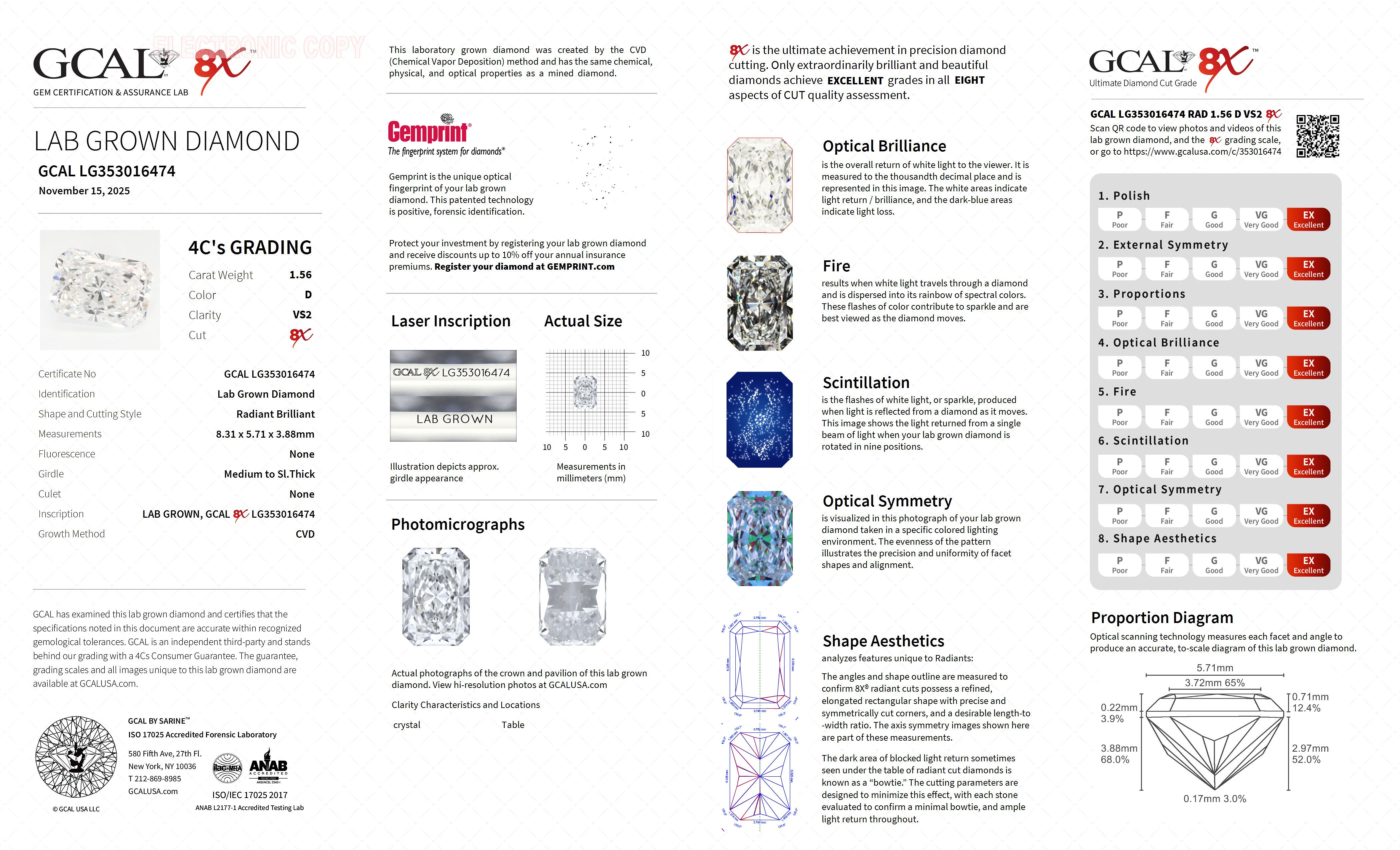 The GCAL certificate (#353016474) is an independent grading report that verifies this diamond's carat weight, color, clarity, cut, and other physical properties. It serves as a trusted third-party guarantee of the stone's quality. Always verify the certificate number on the issuing lab's website before purchasing.