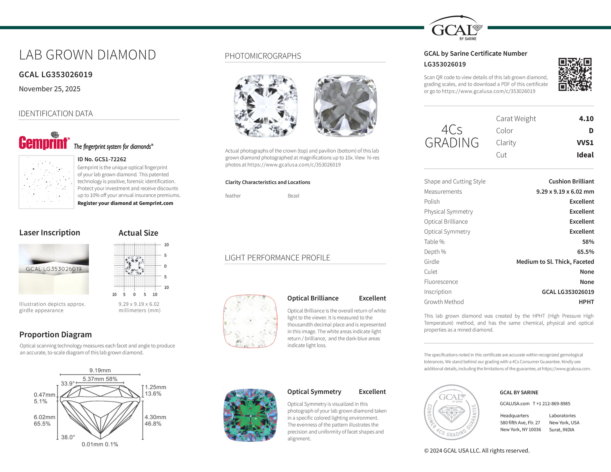 The GCAL certificate (#353026019) is an independent grading report that verifies this diamond's carat weight, color, clarity, cut, and other physical properties. It serves as a trusted third-party guarantee of the stone's quality. Always verify the certificate number on the issuing lab's website before purchasing.