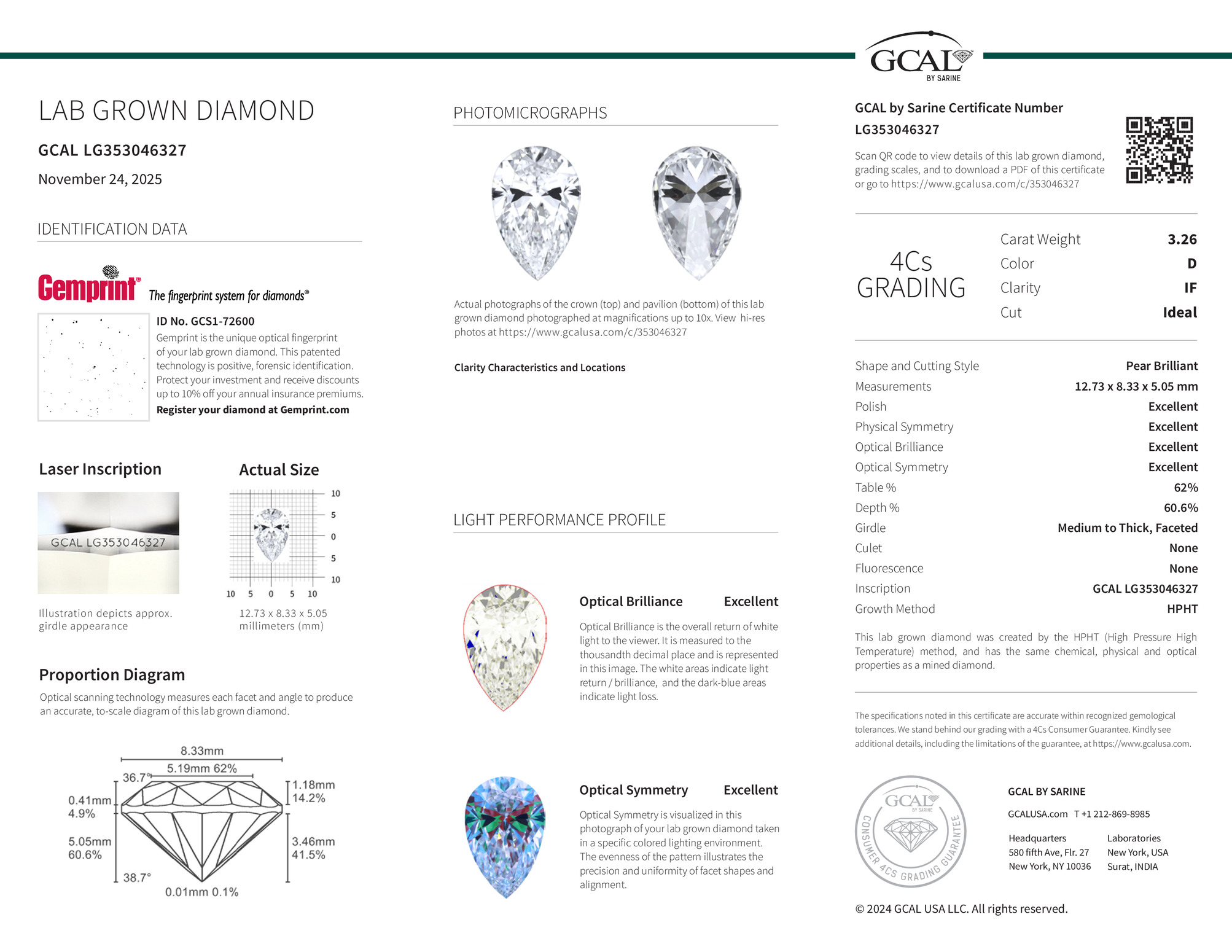 The GCAL certificate (#353046327) is an independent grading report that verifies this diamond's carat weight, color, clarity, cut, and other physical properties. It serves as a trusted third-party guarantee of the stone's quality. Always verify the certificate number on the issuing lab's website before purchasing.