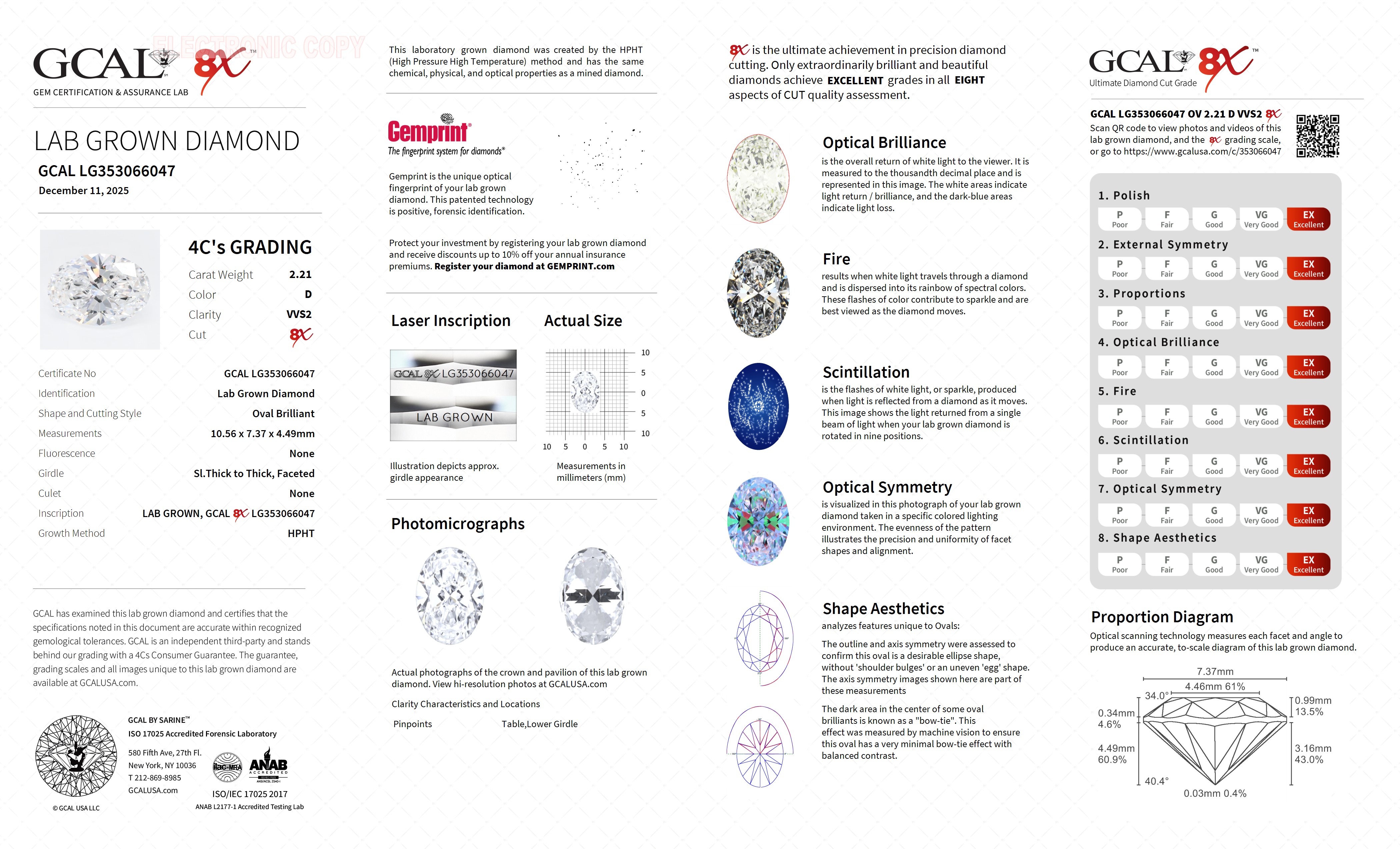 The GCAL certificate (#353066047) is an independent grading report that verifies this diamond's carat weight, color, clarity, cut, and other physical properties. It serves as a trusted third-party guarantee of the stone's quality. Always verify the certificate number on the issuing lab's website before purchasing.