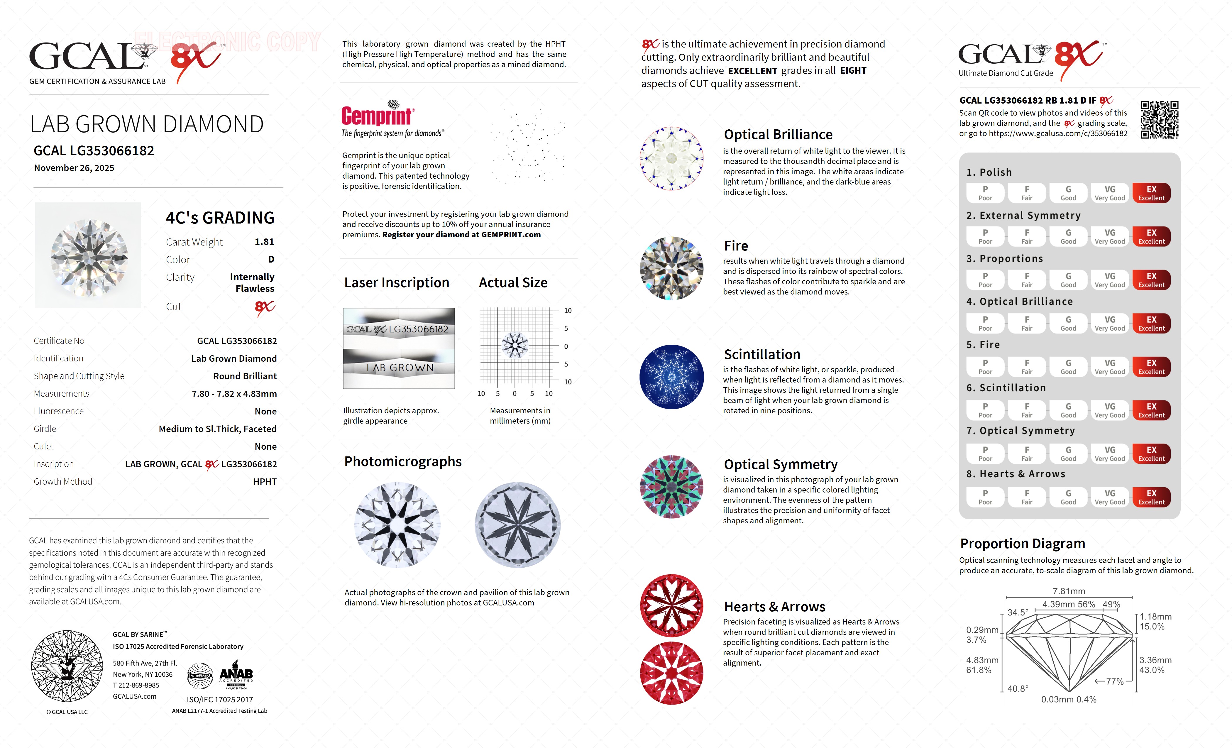 The GCAL certificate (#353066182) is an independent grading report that verifies this diamond's carat weight, color, clarity, cut, and other physical properties. It serves as a trusted third-party guarantee of the stone's quality. Always verify the certificate number on the issuing lab's website before purchasing.