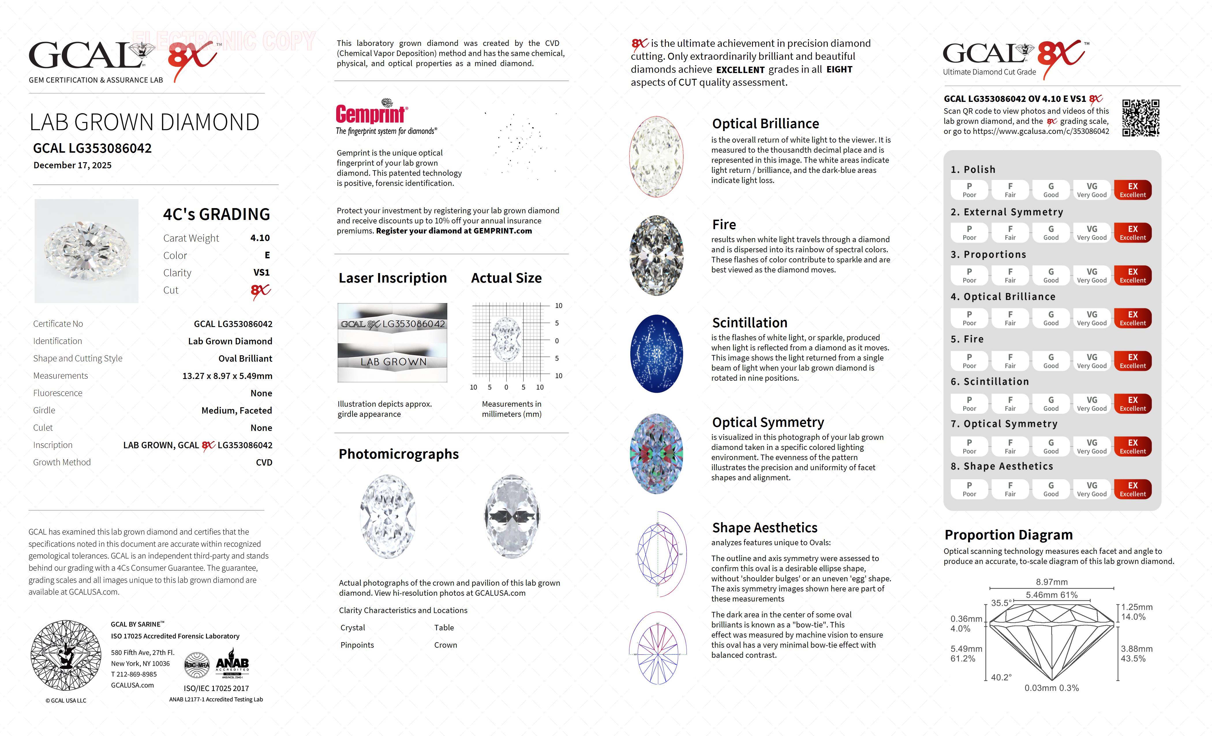The GCAL certificate (#353086042) is an independent grading report that verifies this diamond's carat weight, color, clarity, cut, and other physical properties. It serves as a trusted third-party guarantee of the stone's quality. Always verify the certificate number on the issuing lab's website before purchasing.