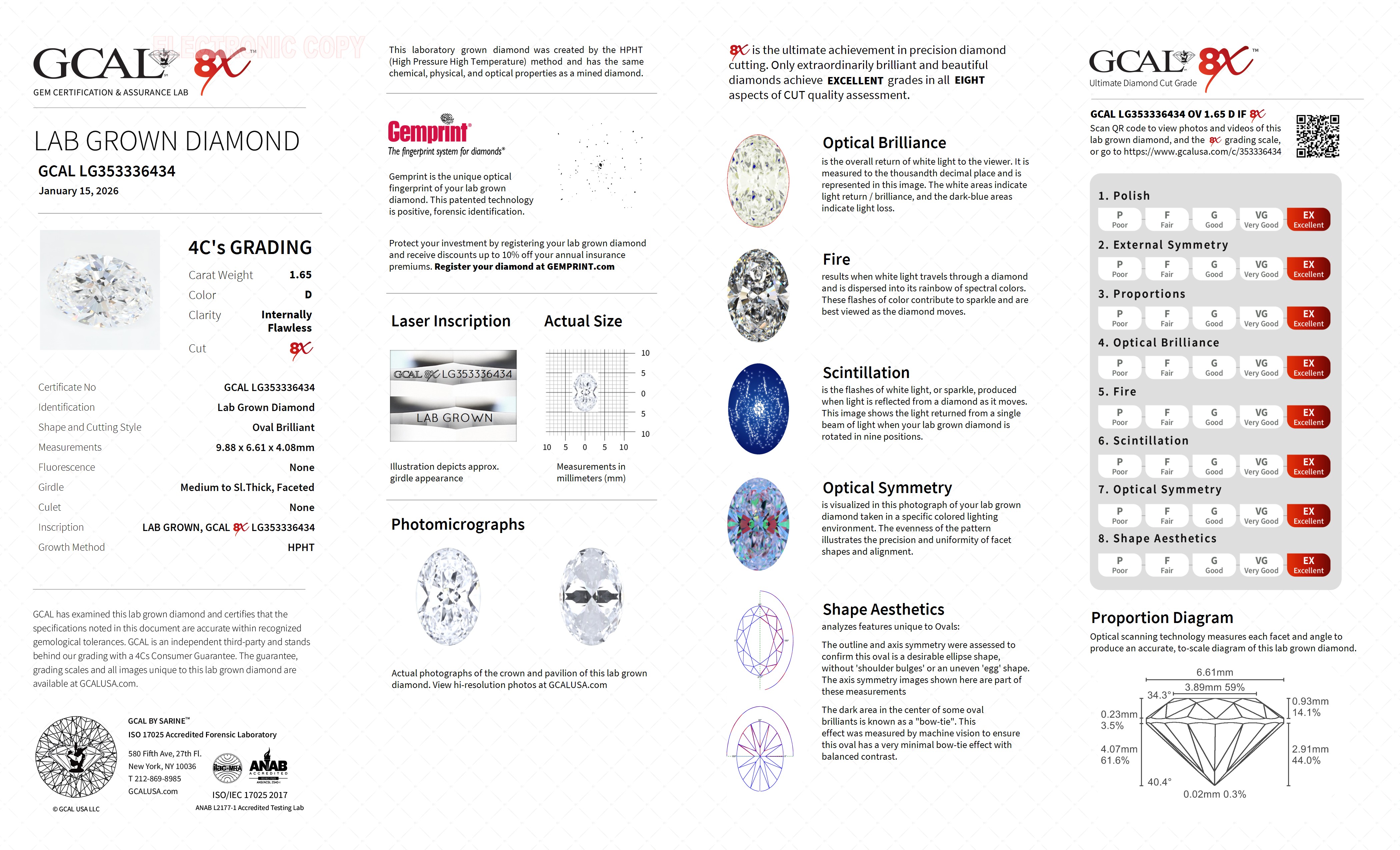 The GCAL certificate (#353336434) is an independent grading report that verifies this diamond's carat weight, color, clarity, cut, and other physical properties. It serves as a trusted third-party guarantee of the stone's quality. Always verify the certificate number on the issuing lab's website before purchasing.