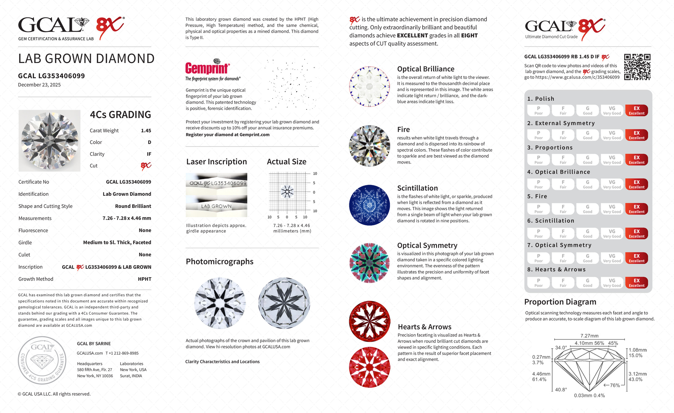 The GCAL certificate (#353406099) is an independent grading report that verifies this diamond's carat weight, color, clarity, cut, and other physical properties. It serves as a trusted third-party guarantee of the stone's quality. Always verify the certificate number on the issuing lab's website before purchasing.