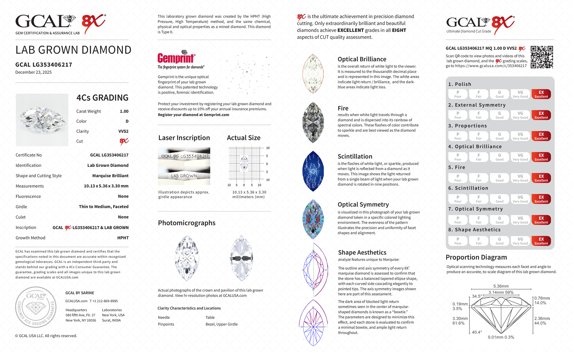 The GCAL certificate (#353406217) is an independent grading report that verifies this diamond's carat weight, color, clarity, cut, and other physical properties. It serves as a trusted third-party guarantee of the stone's quality. Always verify the certificate number on the issuing lab's website before purchasing.