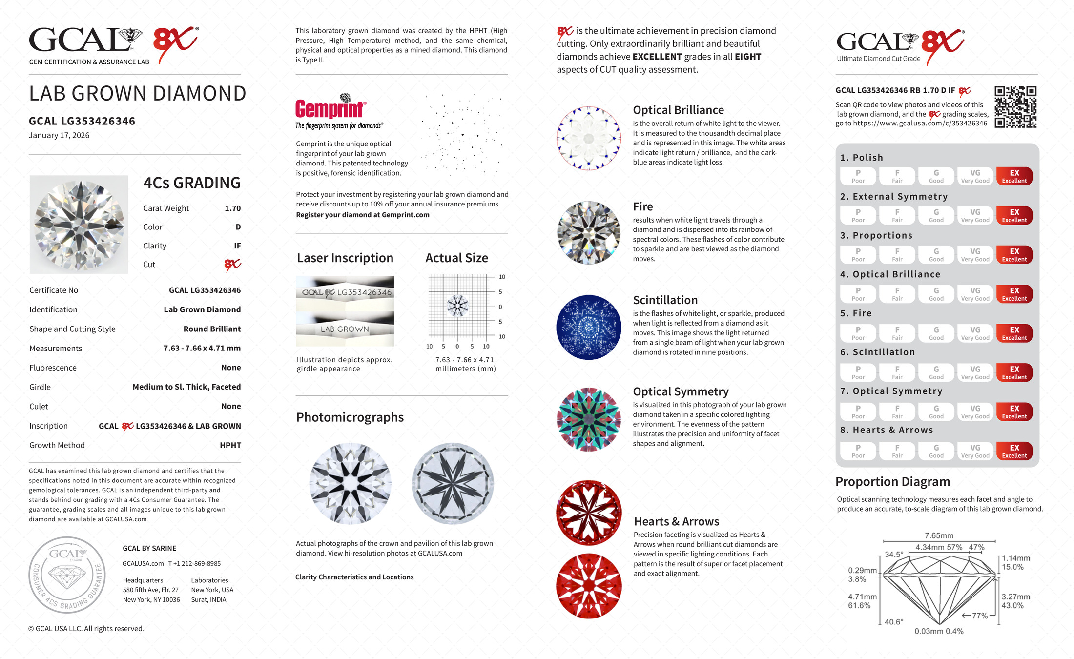 The GCAL certificate (#353426346) is an independent grading report that verifies this diamond's carat weight, color, clarity, cut, and other physical properties. It serves as a trusted third-party guarantee of the stone's quality. Always verify the certificate number on the issuing lab's website before purchasing.