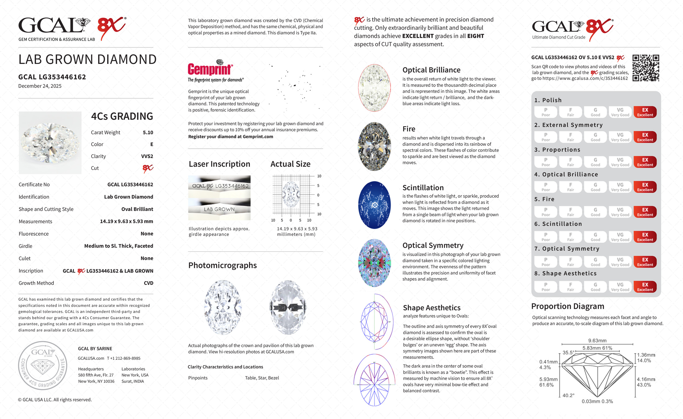 The GCAL certificate (#353446162) is an independent grading report that verifies this diamond's carat weight, color, clarity, cut, and other physical properties. It serves as a trusted third-party guarantee of the stone's quality. Always verify the certificate number on the issuing lab's website before purchasing.
