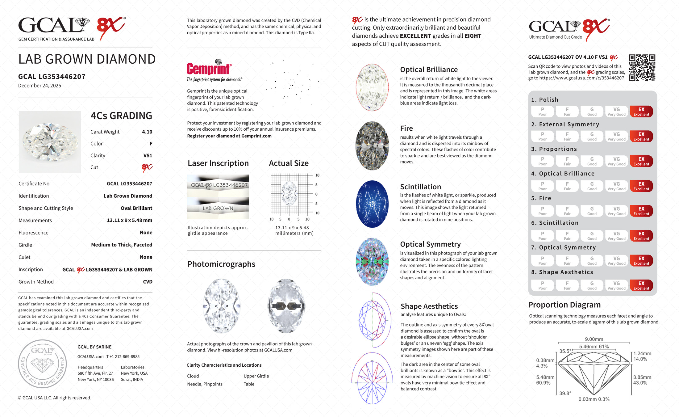 The GCAL certificate (#353446207) is an independent grading report that verifies this diamond's carat weight, color, clarity, cut, and other physical properties. It serves as a trusted third-party guarantee of the stone's quality. Always verify the certificate number on the issuing lab's website before purchasing.