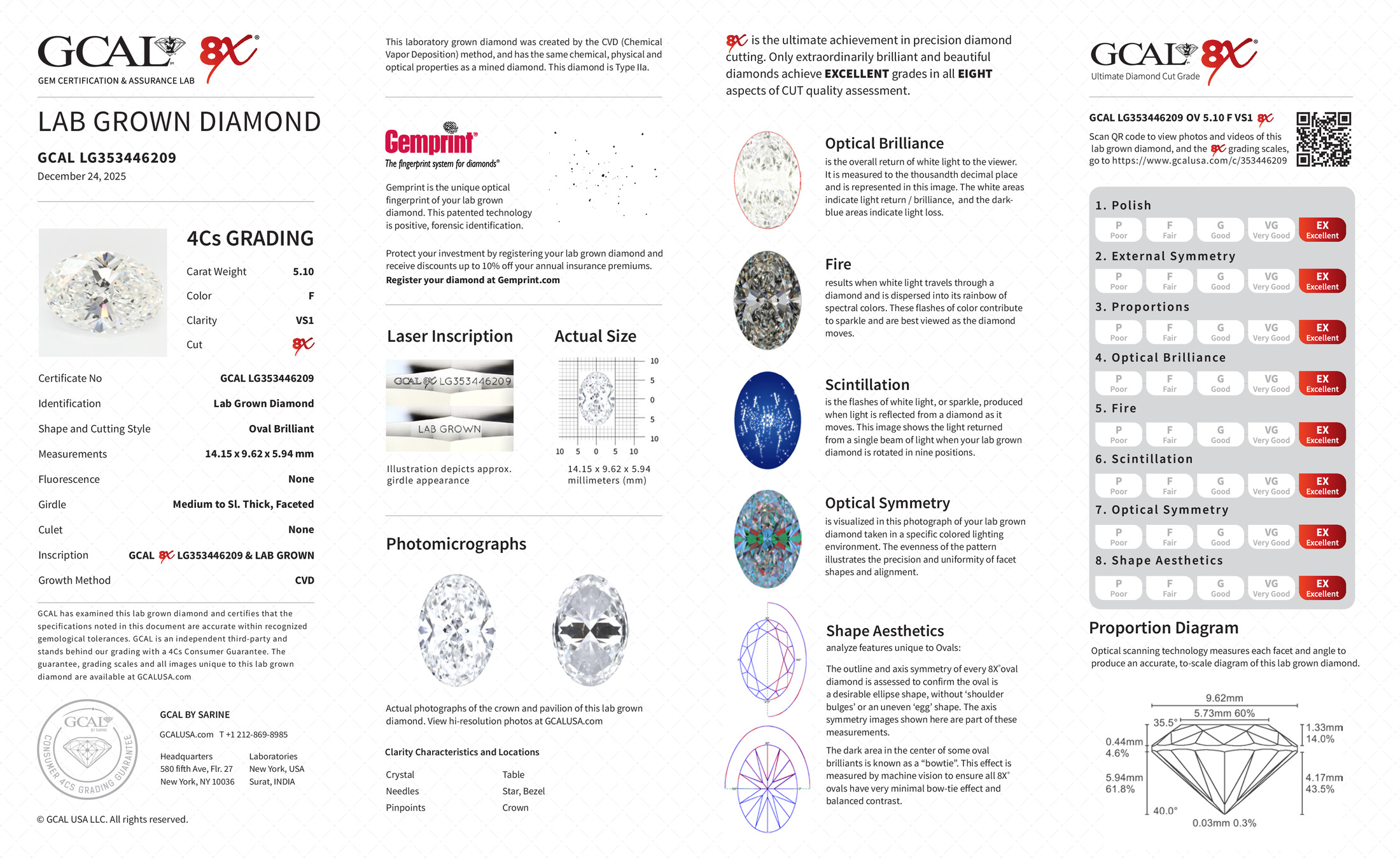 The GCAL certificate (#353446209) is an independent grading report that verifies this diamond's carat weight, color, clarity, cut, and other physical properties. It serves as a trusted third-party guarantee of the stone's quality. Always verify the certificate number on the issuing lab's website before purchasing.