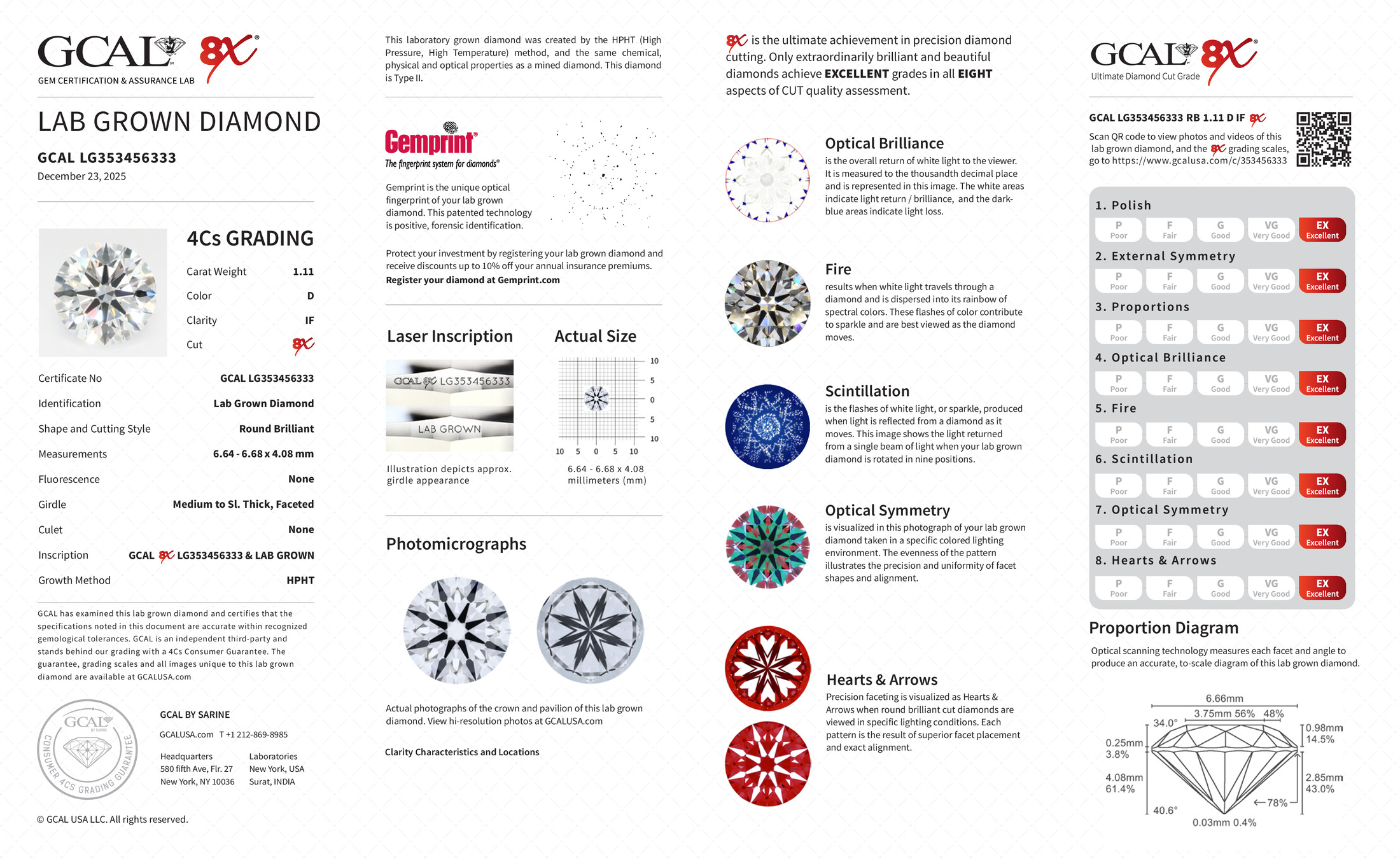 The GCAL certificate (#353456333) is an independent grading report that verifies this diamond's carat weight, color, clarity, cut, and other physical properties. It serves as a trusted third-party guarantee of the stone's quality. Always verify the certificate number on the issuing lab's website before purchasing.