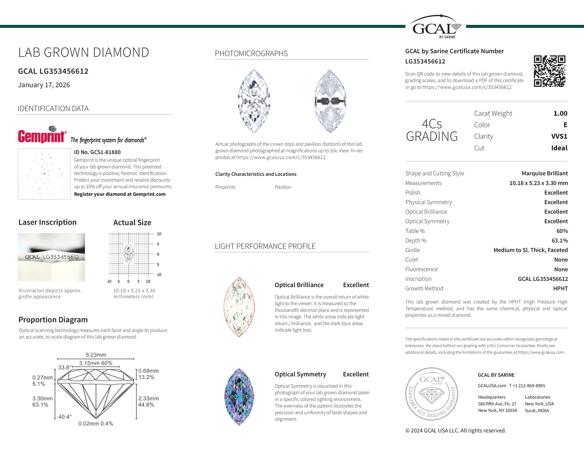 The GCAL certificate (#353456612) is an independent grading report that verifies this diamond's carat weight, color, clarity, cut, and other physical properties. It serves as a trusted third-party guarantee of the stone's quality. Always verify the certificate number on the issuing lab's website before purchasing.