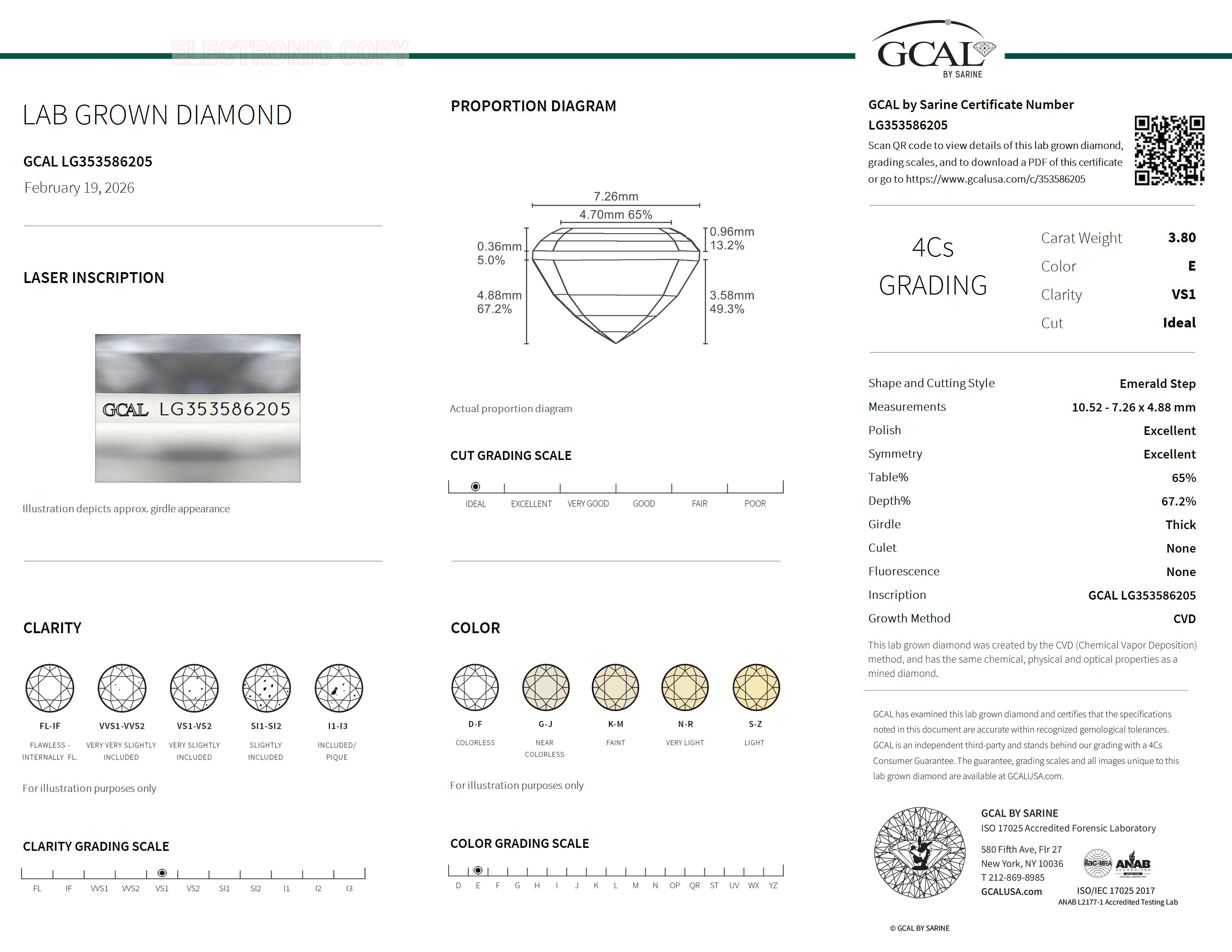 The GCAL certificate (#353586205) is an independent grading report that verifies this diamond's carat weight, color, clarity, cut, and other physical properties. It serves as a trusted third-party guarantee of the stone's quality. Always verify the certificate number on the issuing lab's website before purchasing.