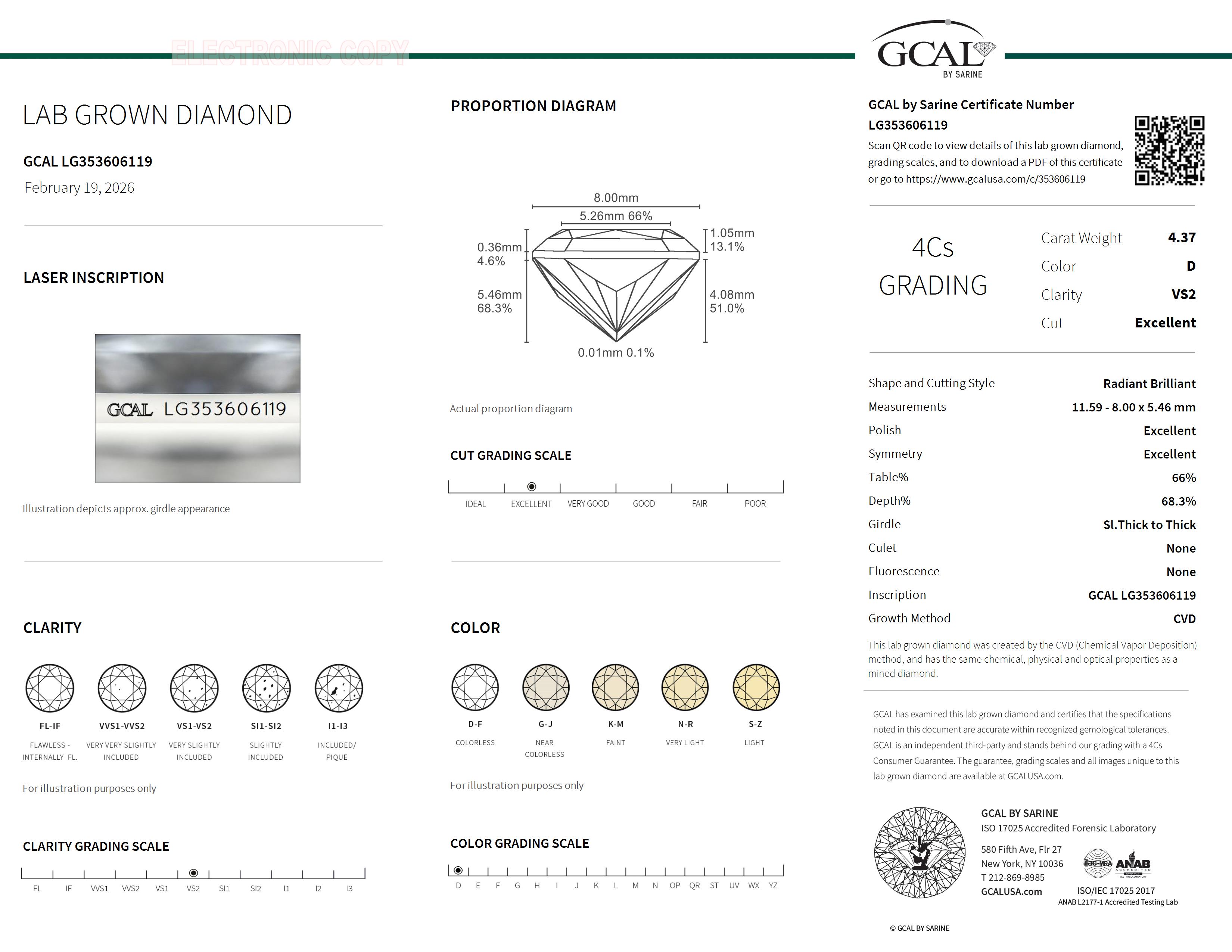 The GCAL certificate (#353606119) is an independent grading report that verifies this diamond's carat weight, color, clarity, cut, and other physical properties. It serves as a trusted third-party guarantee of the stone's quality. Always verify the certificate number on the issuing lab's website before purchasing.