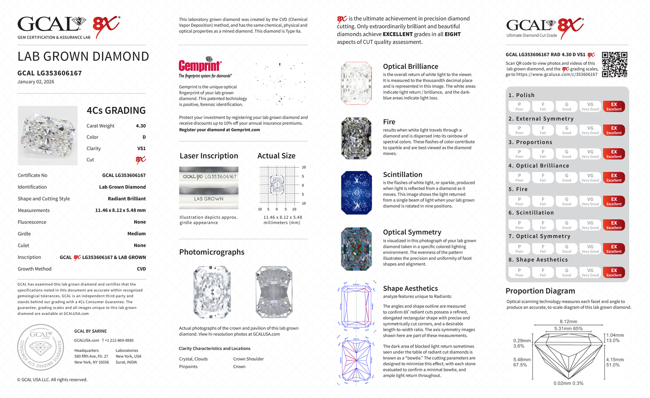 The GCAL certificate (#353606167) is an independent grading report that verifies this diamond's carat weight, color, clarity, cut, and other physical properties. It serves as a trusted third-party guarantee of the stone's quality. Always verify the certificate number on the issuing lab's website before purchasing.