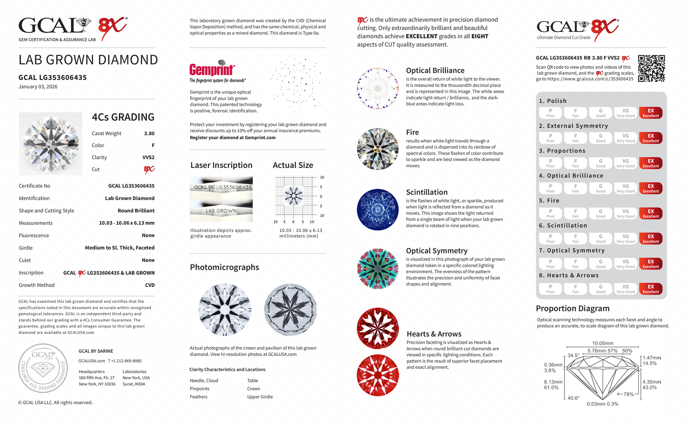 The GCAL certificate (#353606435) is an independent grading report that verifies this diamond's carat weight, color, clarity, cut, and other physical properties. It serves as a trusted third-party guarantee of the stone's quality. Always verify the certificate number on the issuing lab's website before purchasing.