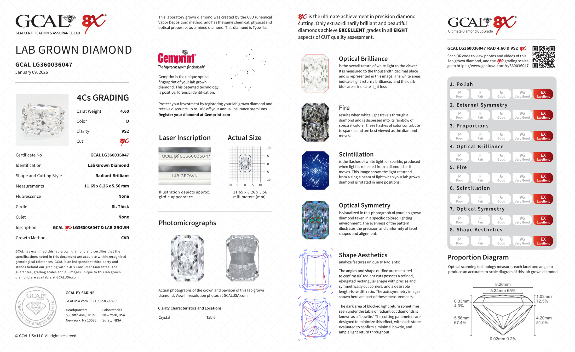 The GCAL certificate (#360036047) is an independent grading report that verifies this diamond's carat weight, color, clarity, cut, and other physical properties. It serves as a trusted third-party guarantee of the stone's quality. Always verify the certificate number on the issuing lab's website before purchasing.