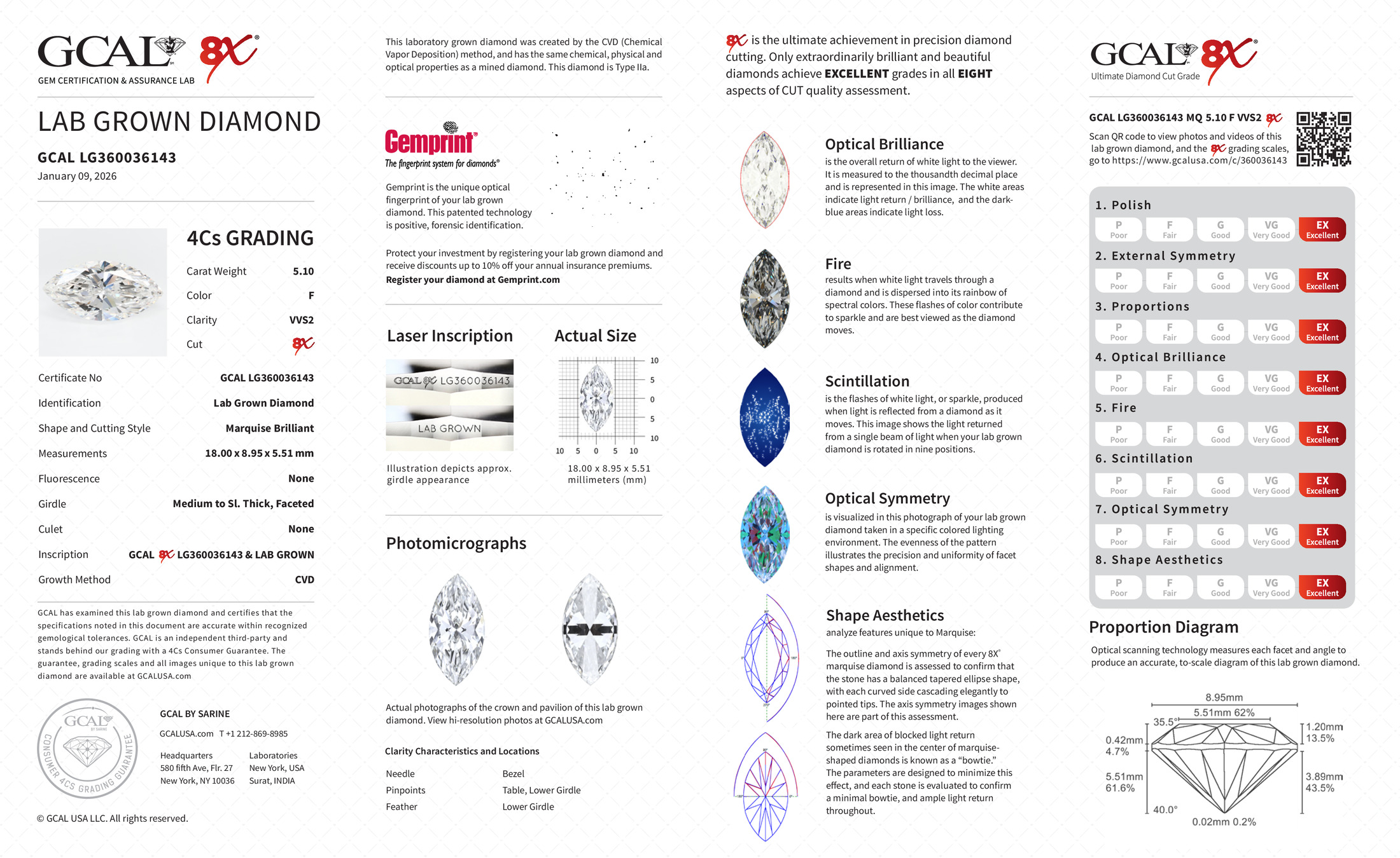The GCAL certificate (#360036143) is an independent grading report that verifies this diamond's carat weight, color, clarity, cut, and other physical properties. It serves as a trusted third-party guarantee of the stone's quality. Always verify the certificate number on the issuing lab's website before purchasing.