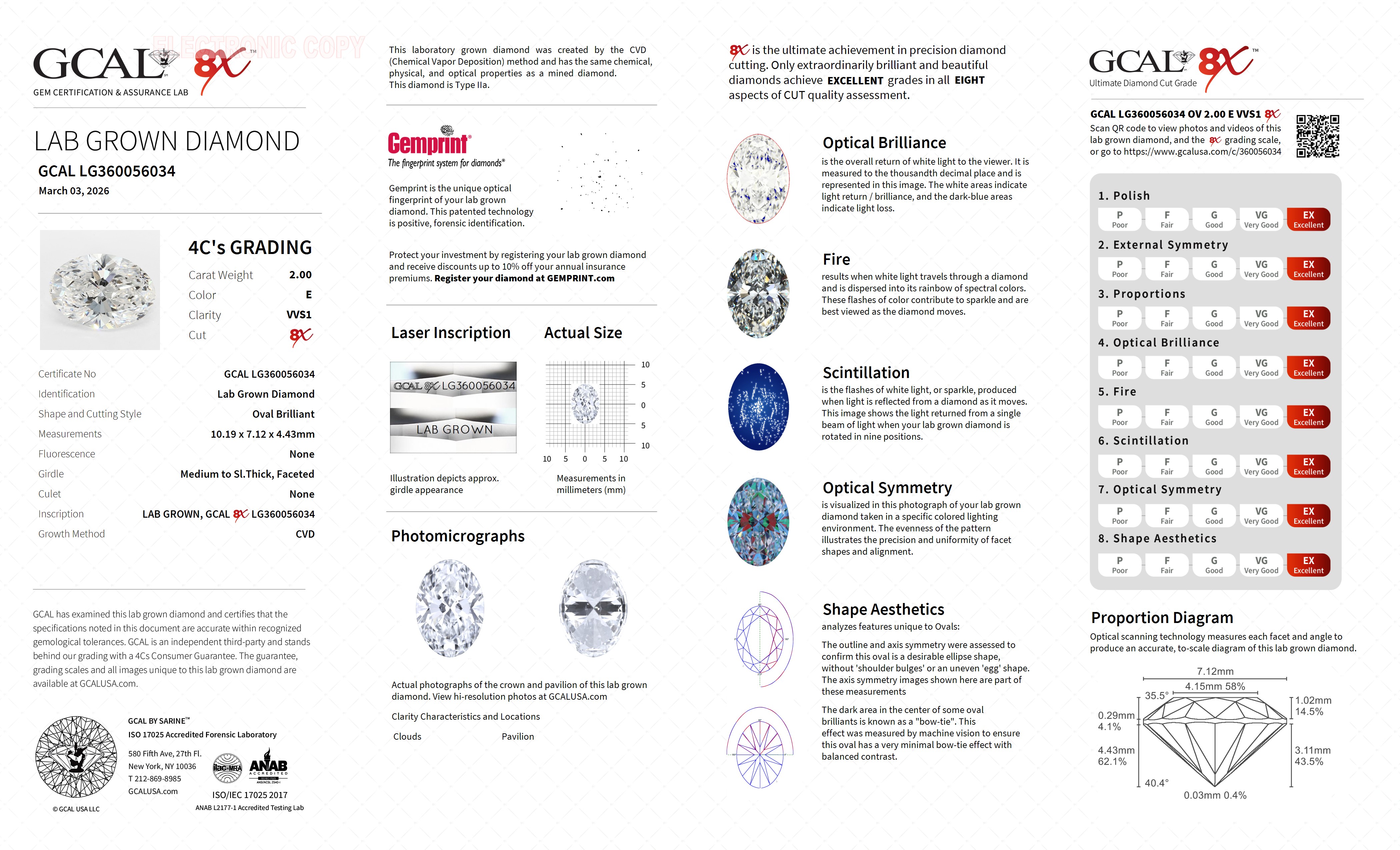 The GCAL certificate (#360056034) is an independent grading report that verifies this diamond's carat weight, color, clarity, cut, and other physical properties. It serves as a trusted third-party guarantee of the stone's quality. Always verify the certificate number on the issuing lab's website before purchasing.