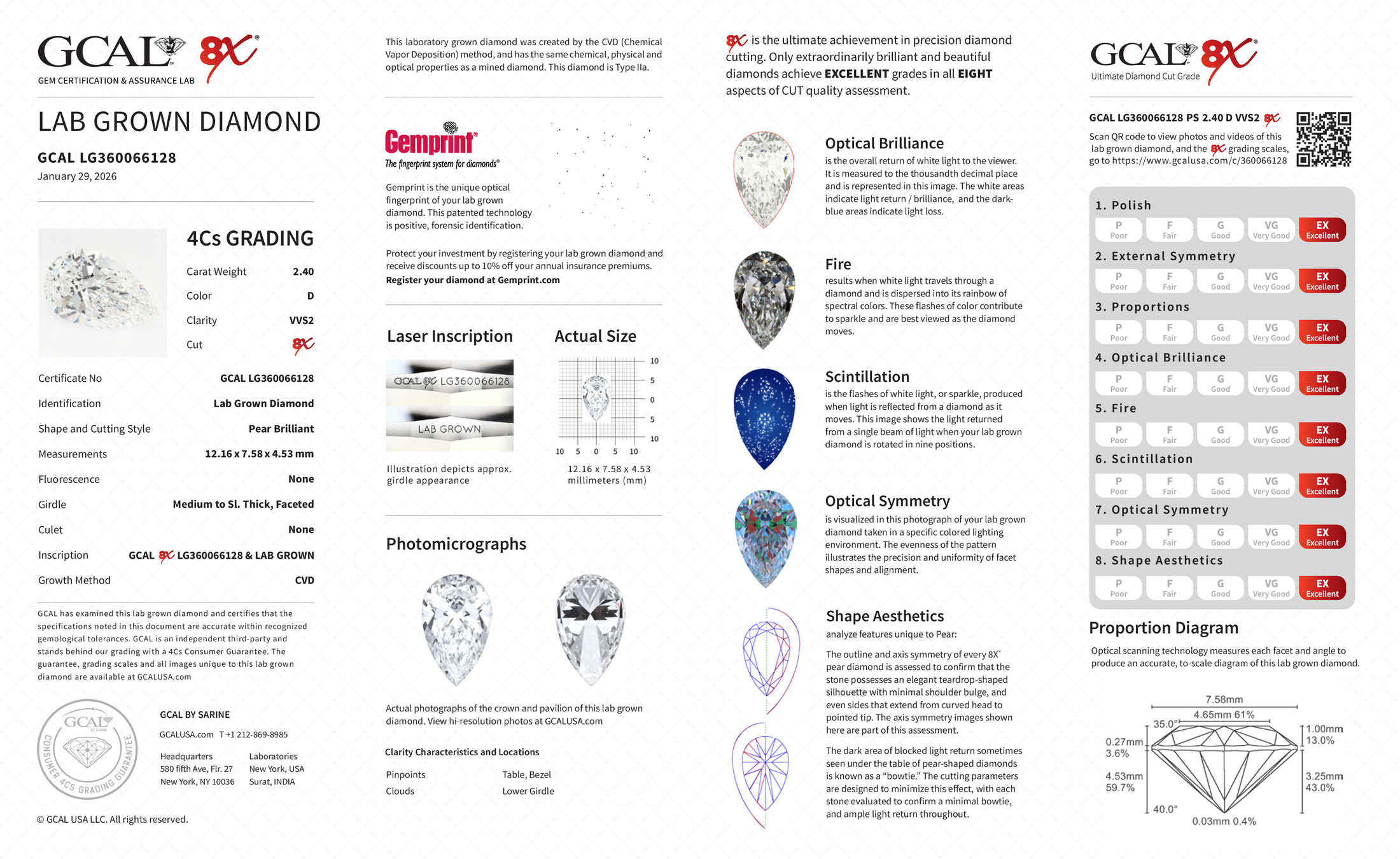 The GCAL certificate (#360066128) is an independent grading report that verifies this diamond's carat weight, color, clarity, cut, and other physical properties. It serves as a trusted third-party guarantee of the stone's quality. Always verify the certificate number on the issuing lab's website before purchasing.