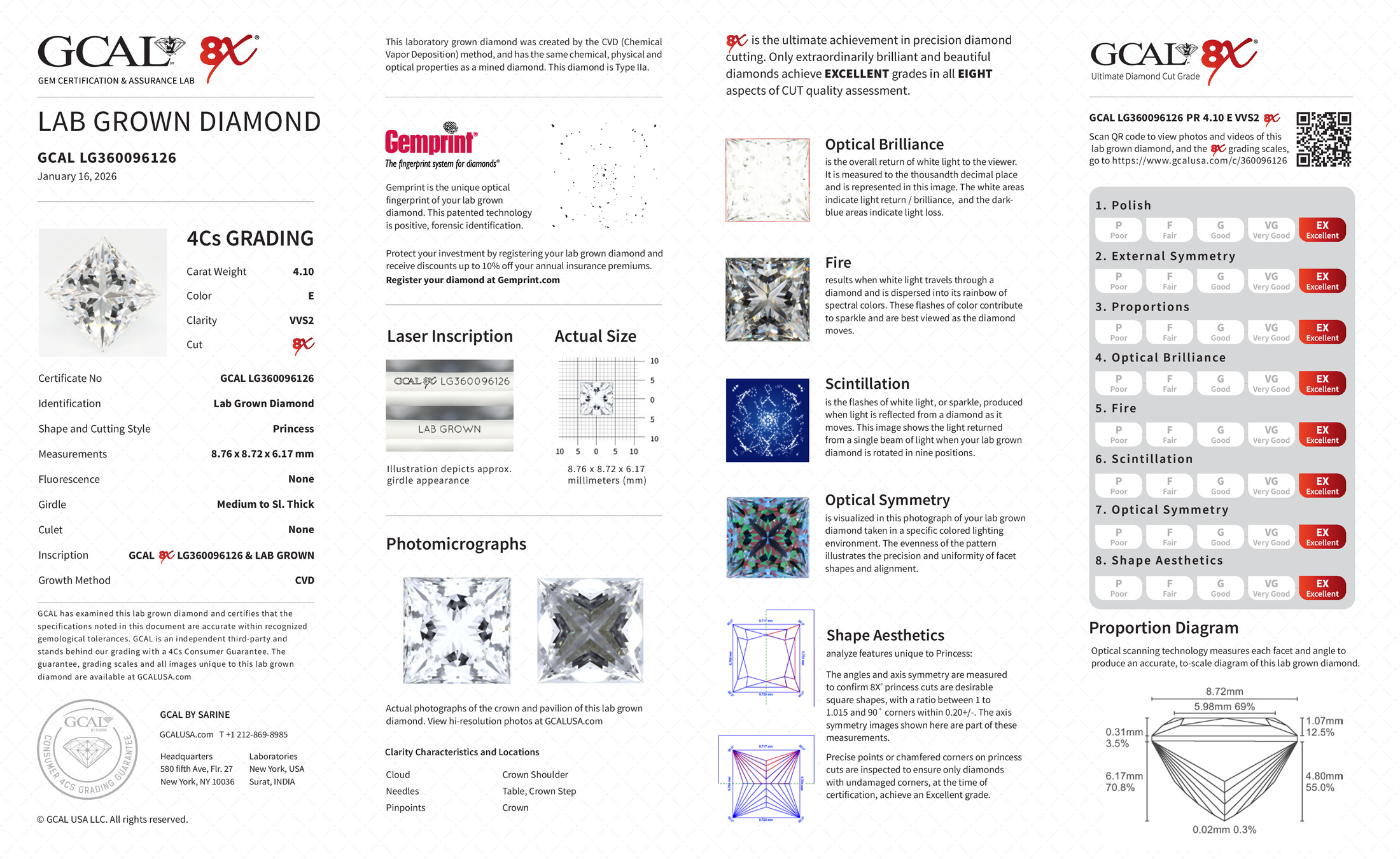 The GCAL certificate (#360096126) is an independent grading report that verifies this diamond's carat weight, color, clarity, cut, and other physical properties. It serves as a trusted third-party guarantee of the stone's quality. Always verify the certificate number on the issuing lab's website before purchasing.