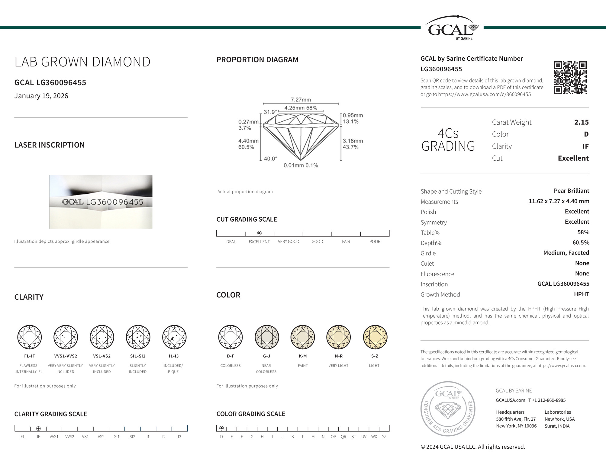 The GCAL certificate (#360096455) is an independent grading report that verifies this diamond's carat weight, color, clarity, cut, and other physical properties. It serves as a trusted third-party guarantee of the stone's quality. Always verify the certificate number on the issuing lab's website before purchasing.
