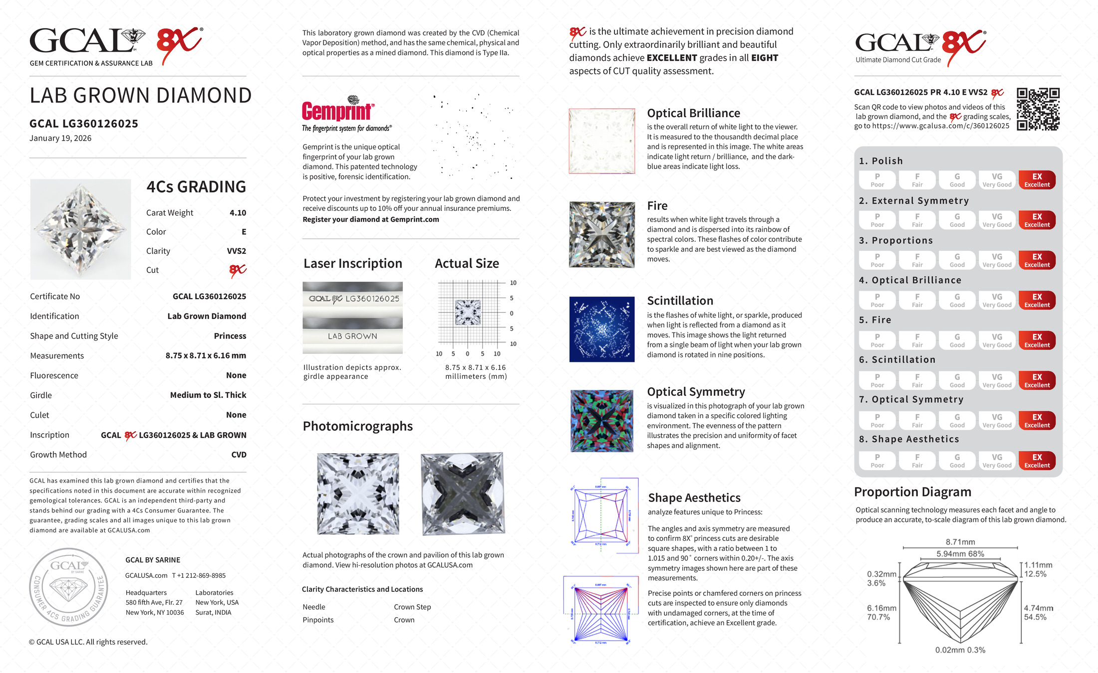 The GCAL certificate (#360126025) is an independent grading report that verifies this diamond's carat weight, color, clarity, cut, and other physical properties. It serves as a trusted third-party guarantee of the stone's quality. Always verify the certificate number on the issuing lab's website before purchasing.