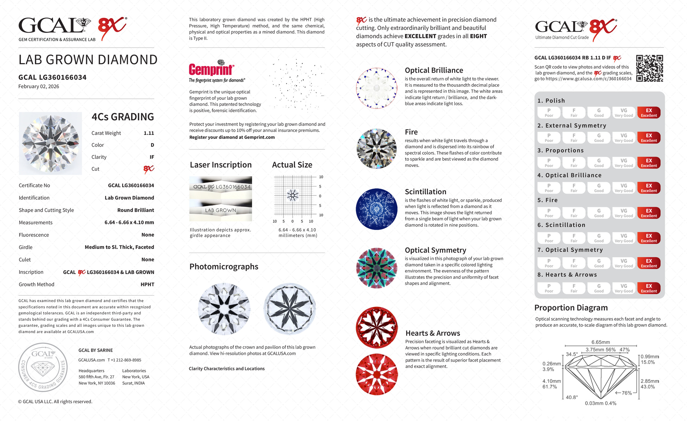 The GCAL certificate (#360166034) is an independent grading report that verifies this diamond's carat weight, color, clarity, cut, and other physical properties. It serves as a trusted third-party guarantee of the stone's quality. Always verify the certificate number on the issuing lab's website before purchasing.