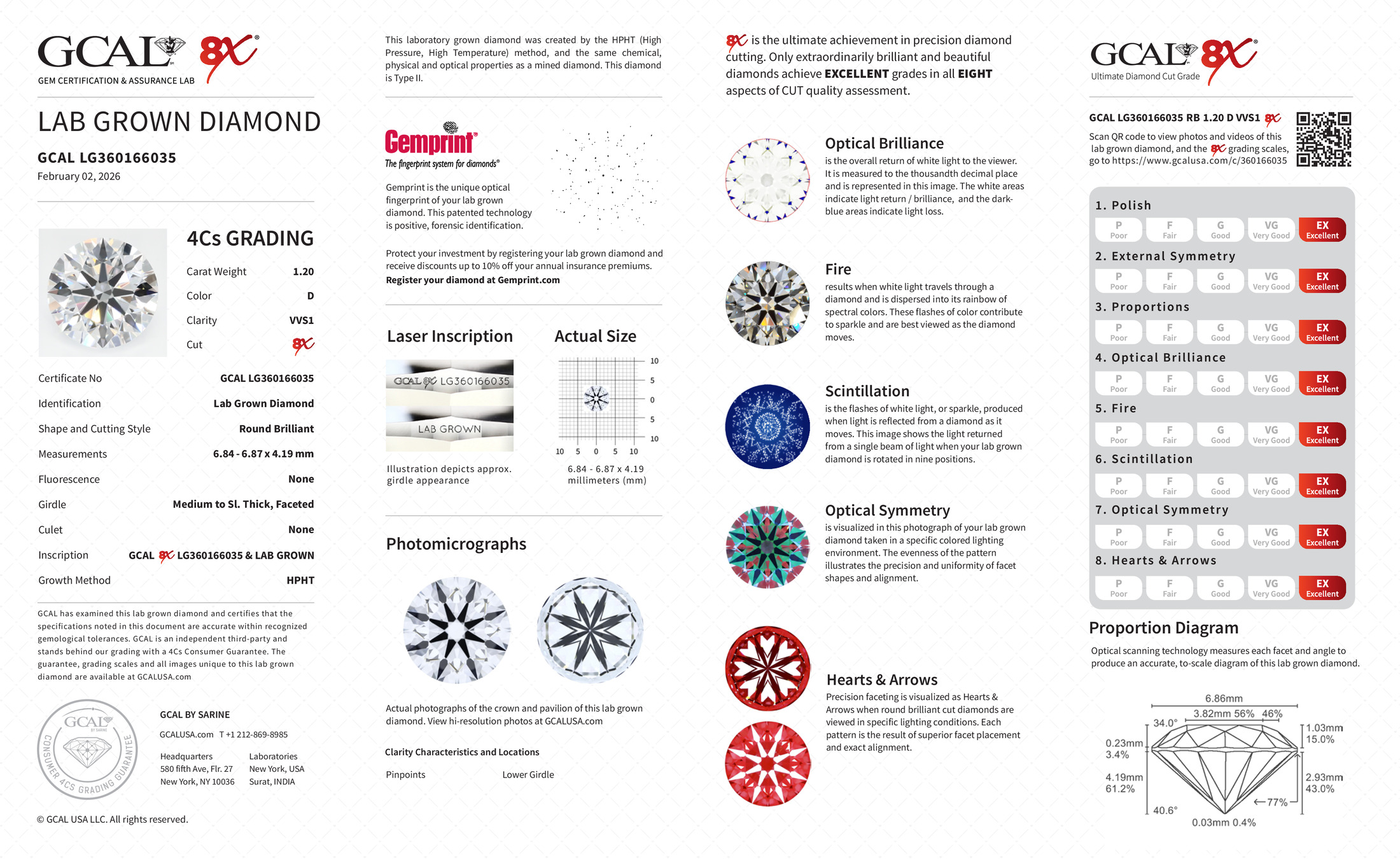 The GCAL certificate (#360166035) is an independent grading report that verifies this diamond's carat weight, color, clarity, cut, and other physical properties. It serves as a trusted third-party guarantee of the stone's quality. Always verify the certificate number on the issuing lab's website before purchasing.