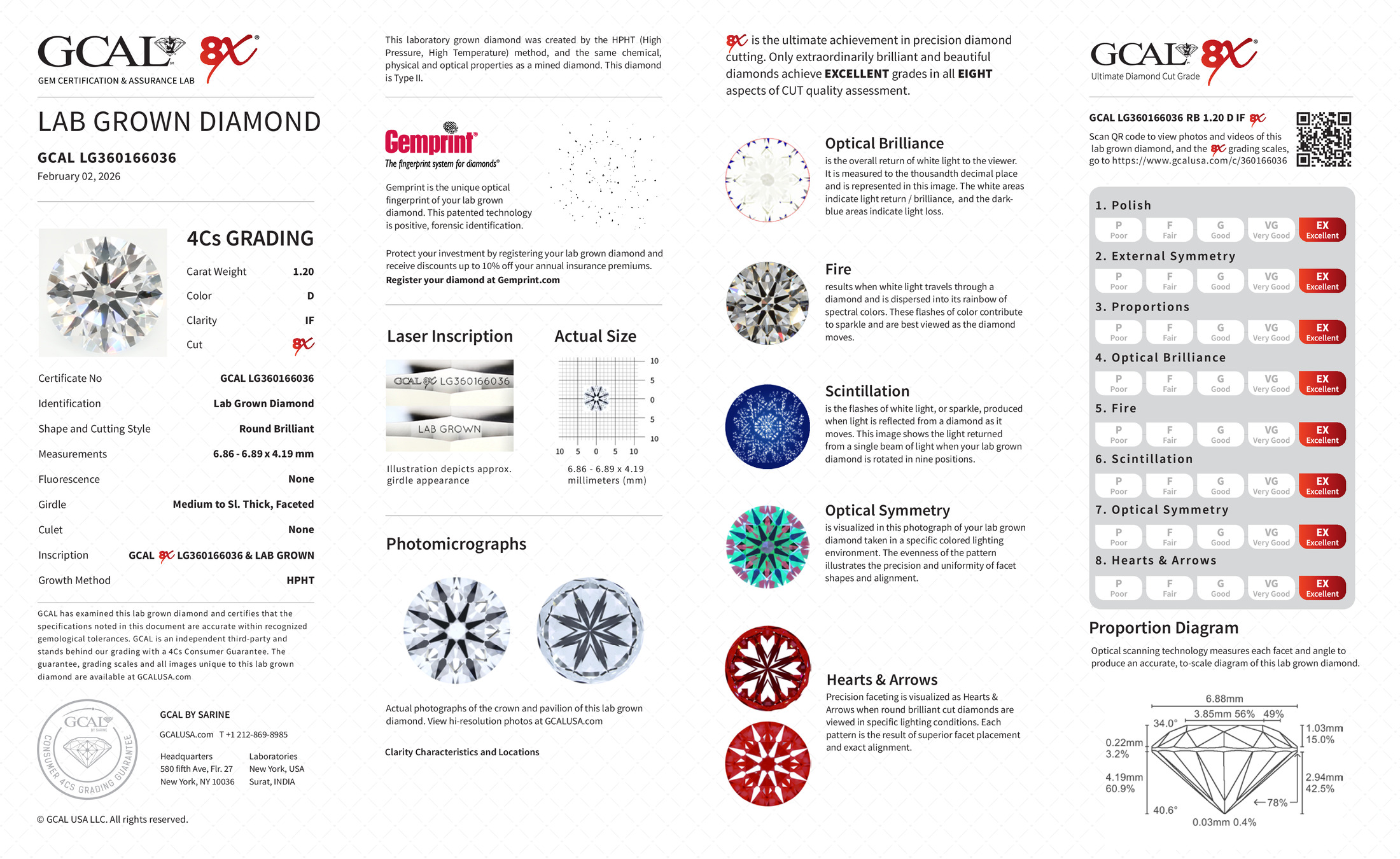 The GCAL certificate (#360166036) is an independent grading report that verifies this diamond's carat weight, color, clarity, cut, and other physical properties. It serves as a trusted third-party guarantee of the stone's quality. Always verify the certificate number on the issuing lab's website before purchasing.