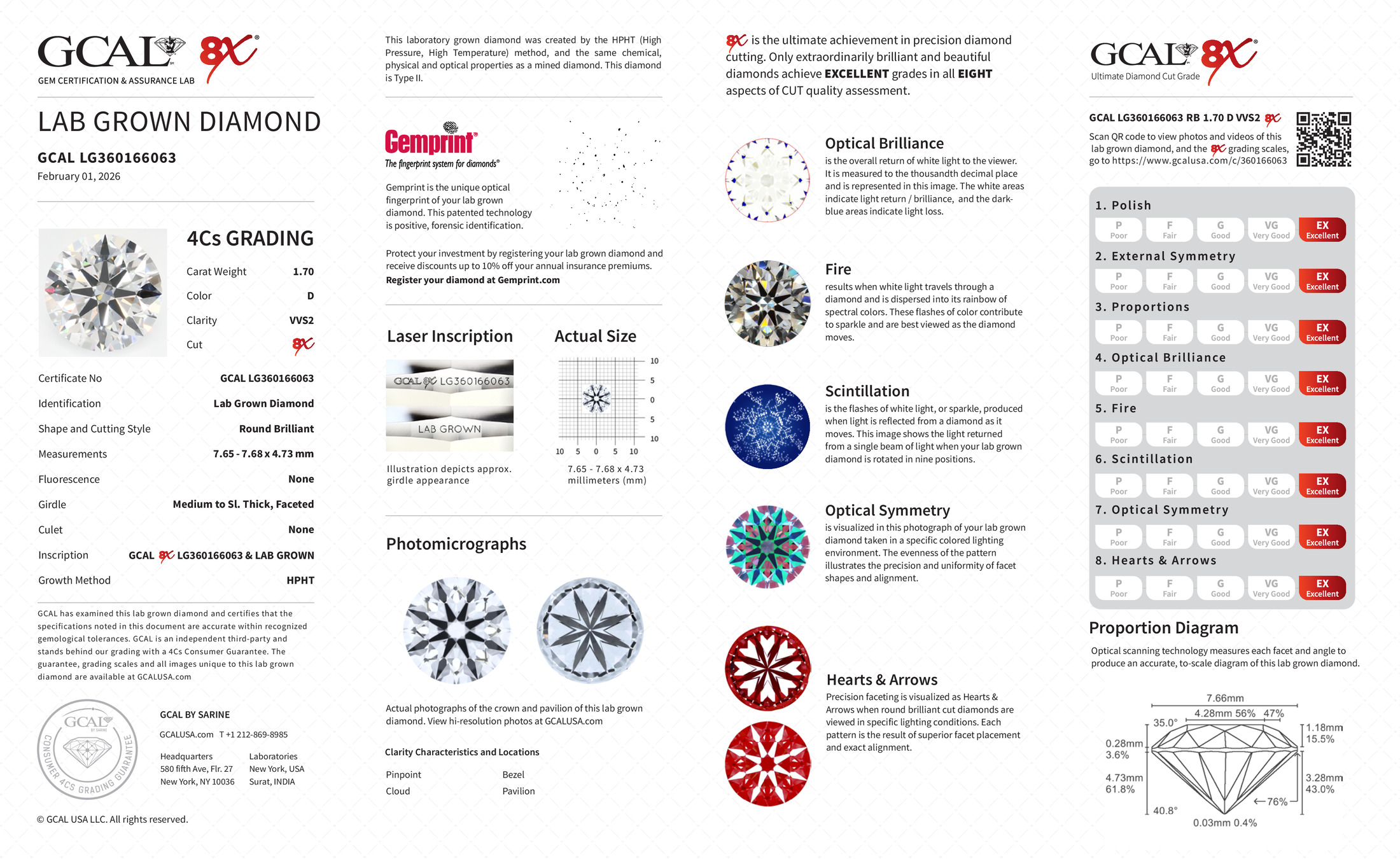 The GCAL certificate (#360166063) is an independent grading report that verifies this diamond's carat weight, color, clarity, cut, and other physical properties. It serves as a trusted third-party guarantee of the stone's quality. Always verify the certificate number on the issuing lab's website before purchasing.