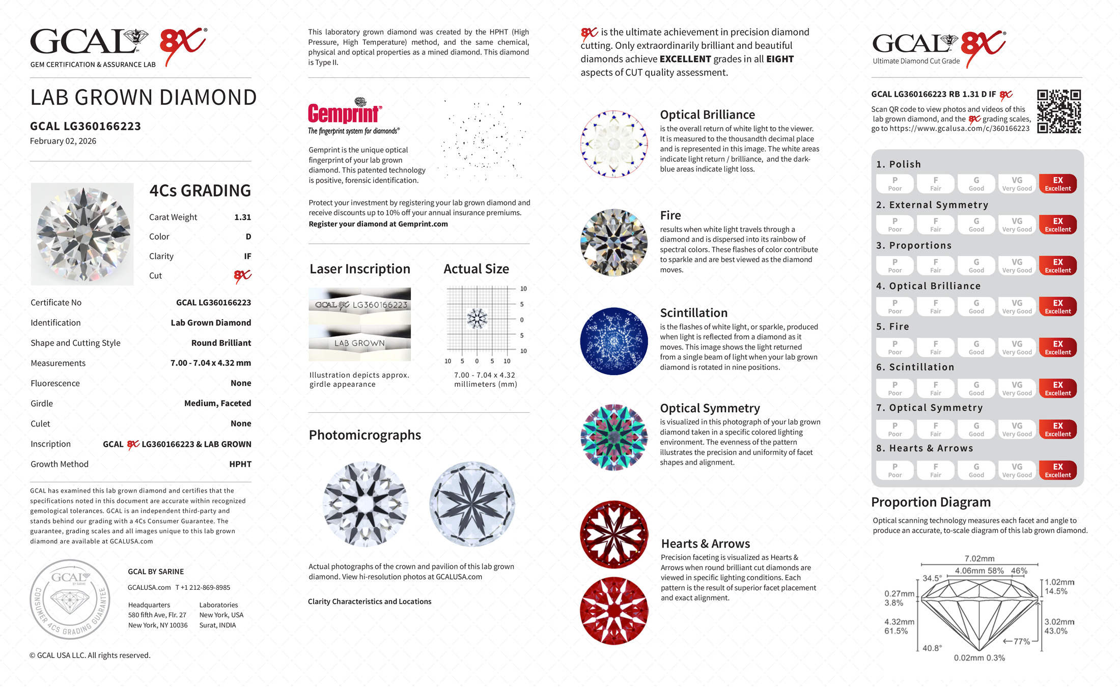 The GCAL certificate (#360166223) is an independent grading report that verifies this diamond's carat weight, color, clarity, cut, and other physical properties. It serves as a trusted third-party guarantee of the stone's quality. Always verify the certificate number on the issuing lab's website before purchasing.
