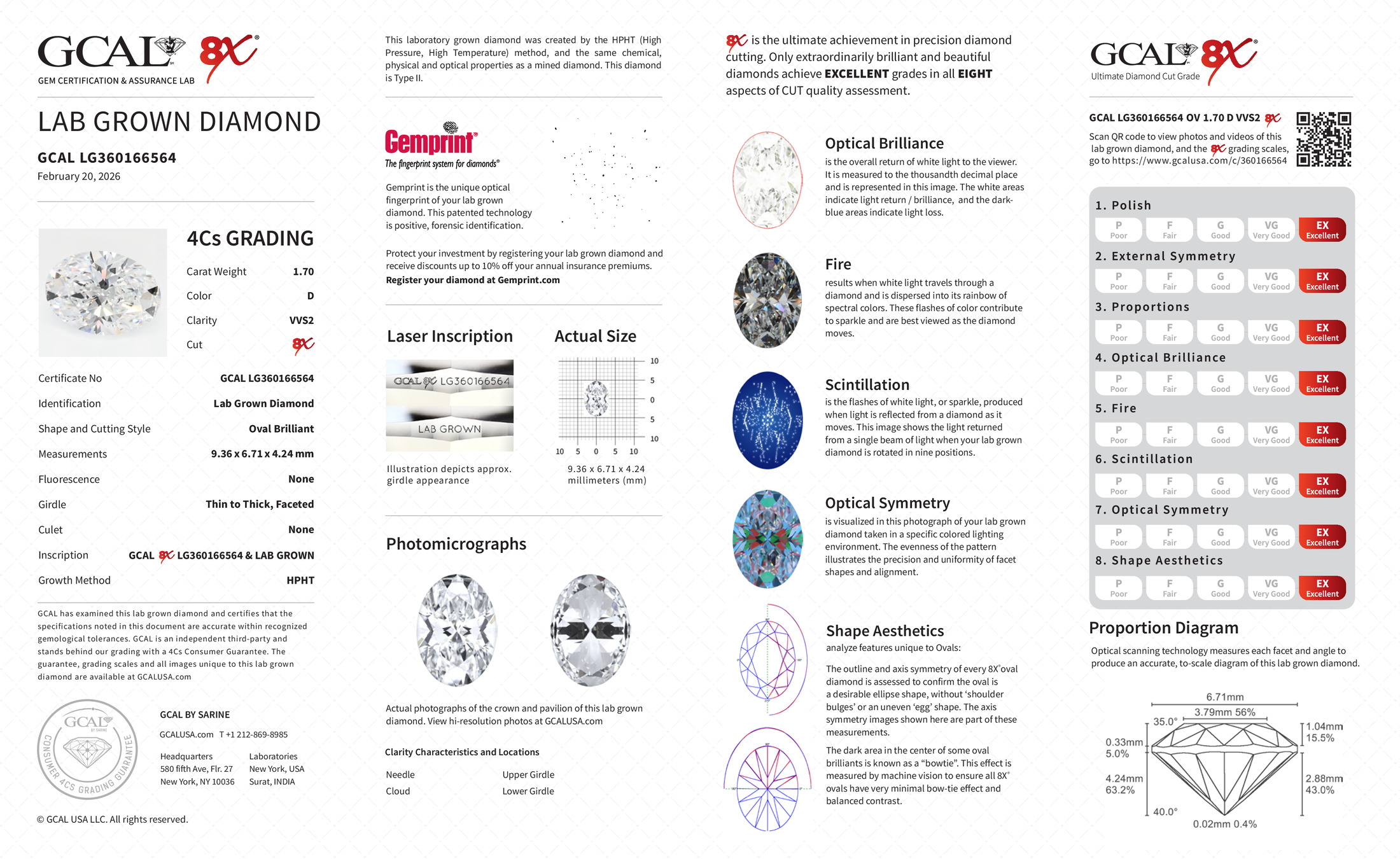 The GCAL certificate (#360166564) is an independent grading report that verifies this diamond's carat weight, color, clarity, cut, and other physical properties. It serves as a trusted third-party guarantee of the stone's quality. Always verify the certificate number on the issuing lab's website before purchasing.