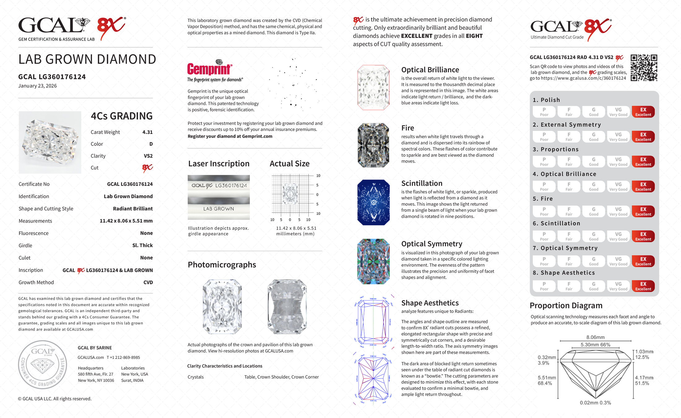 The GCAL certificate (#360176124) is an independent grading report that verifies this diamond's carat weight, color, clarity, cut, and other physical properties. It serves as a trusted third-party guarantee of the stone's quality. Always verify the certificate number on the issuing lab's website before purchasing.