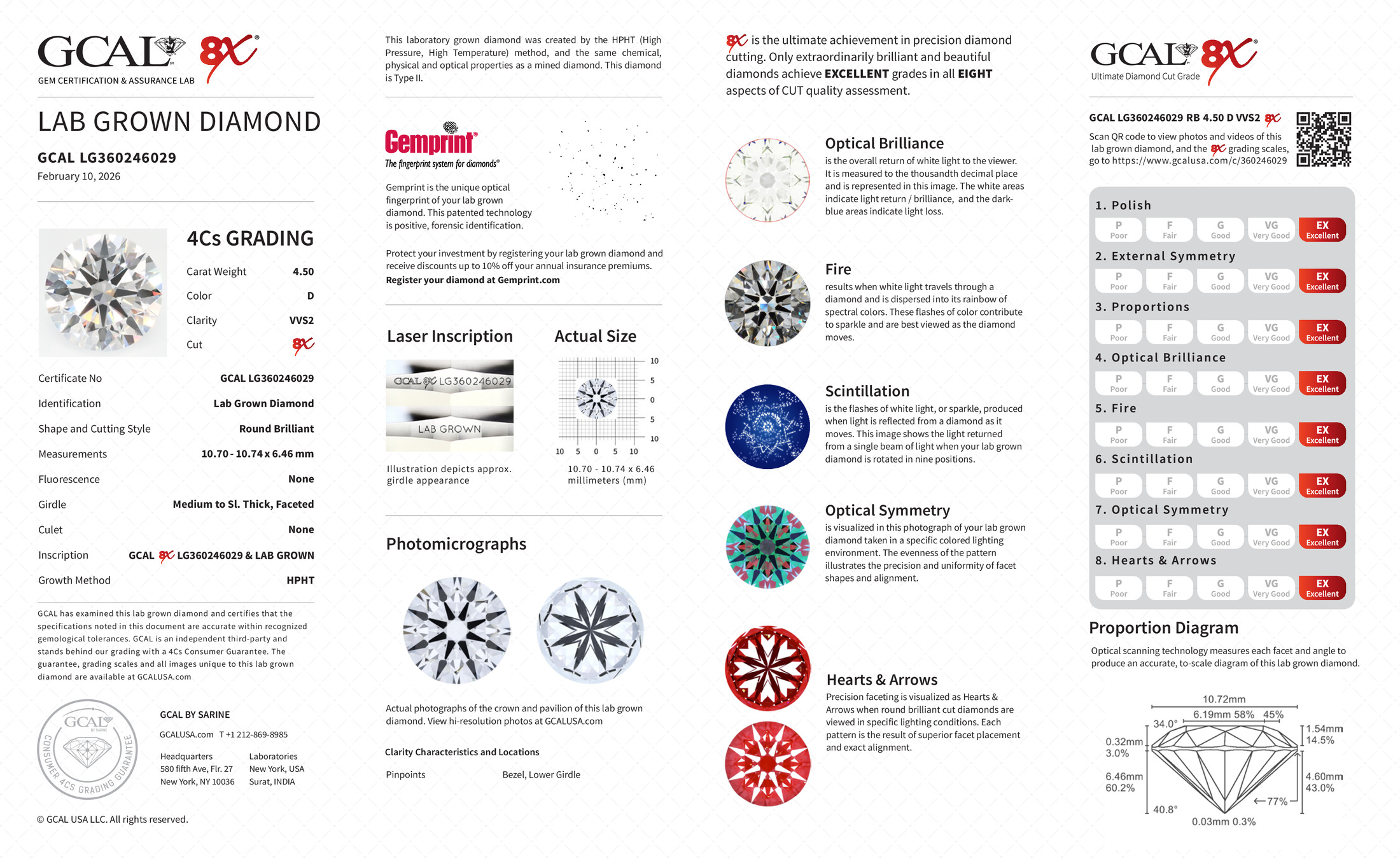 The GCAL certificate (#360246029) is an independent grading report that verifies this diamond's carat weight, color, clarity, cut, and other physical properties. It serves as a trusted third-party guarantee of the stone's quality. Always verify the certificate number on the issuing lab's website before purchasing.