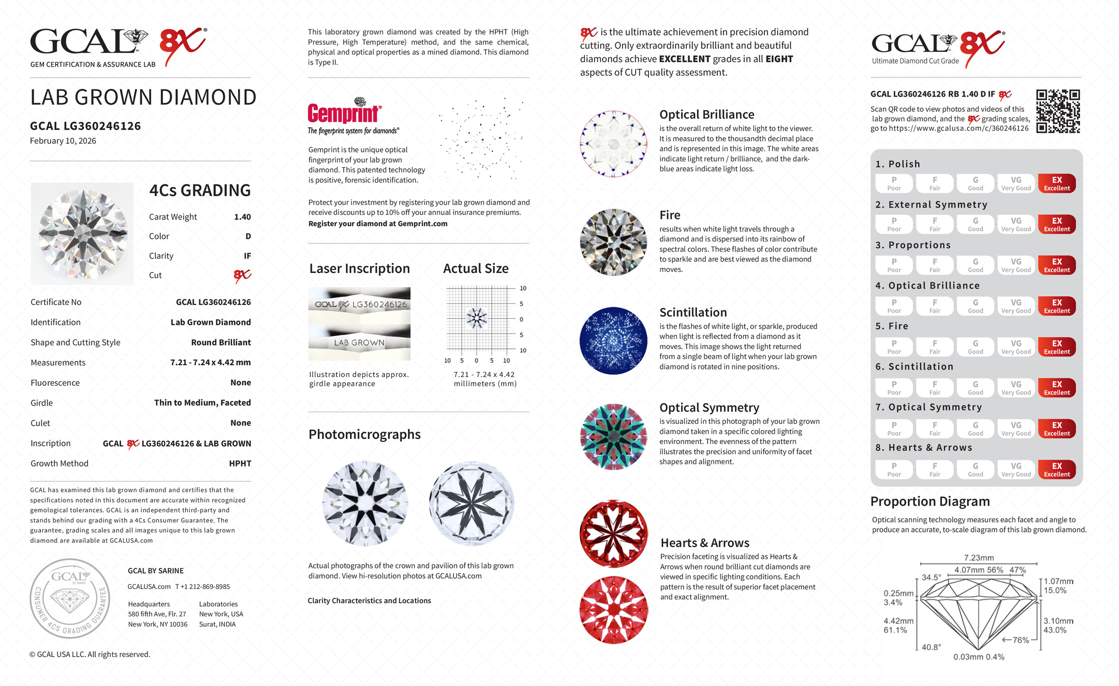 The GCAL certificate (#360246126) is an independent grading report that verifies this diamond's carat weight, color, clarity, cut, and other physical properties. It serves as a trusted third-party guarantee of the stone's quality. Always verify the certificate number on the issuing lab's website before purchasing.