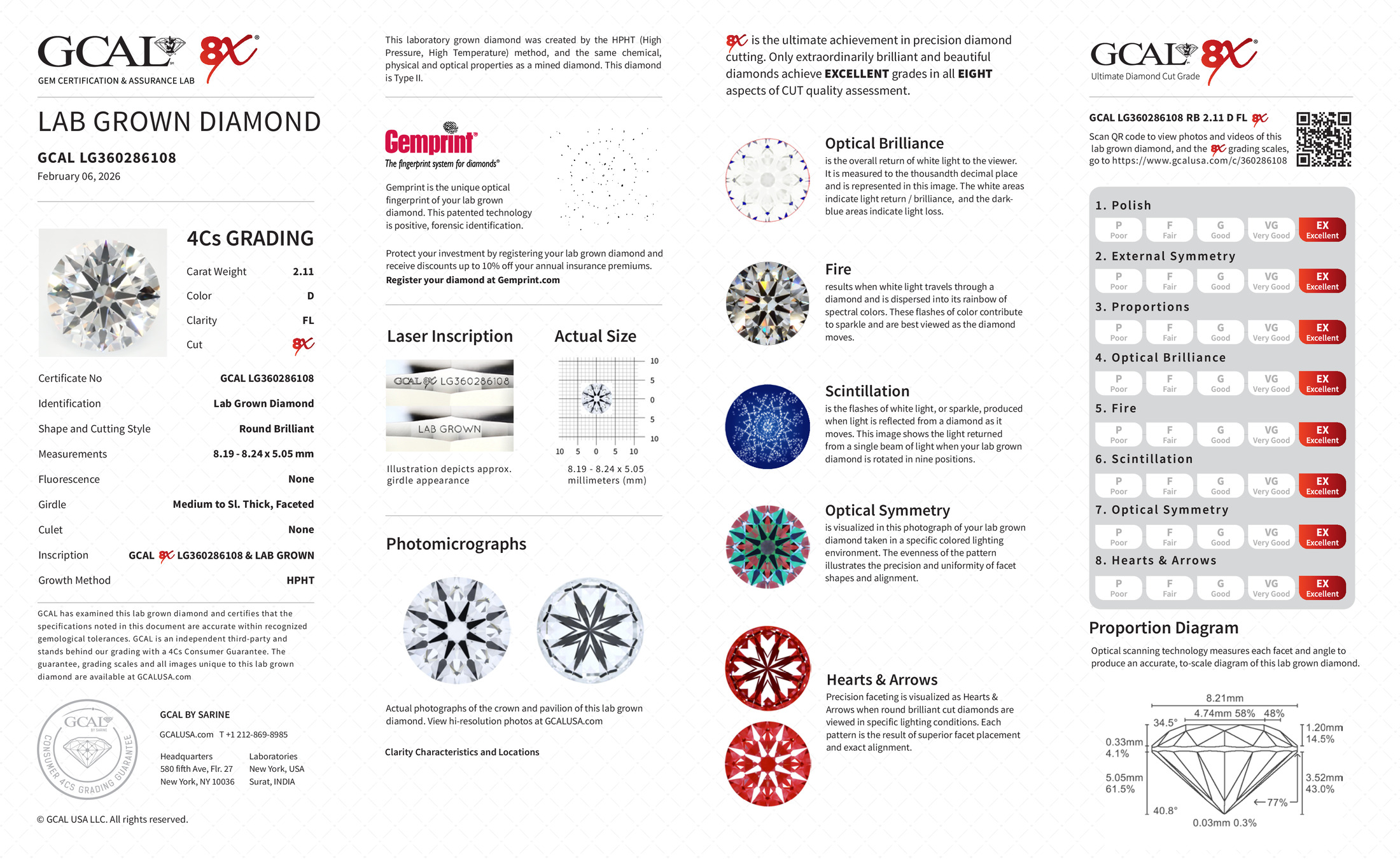 The GCAL certificate (#360286108) is an independent grading report that verifies this diamond's carat weight, color, clarity, cut, and other physical properties. It serves as a trusted third-party guarantee of the stone's quality. Always verify the certificate number on the issuing lab's website before purchasing.